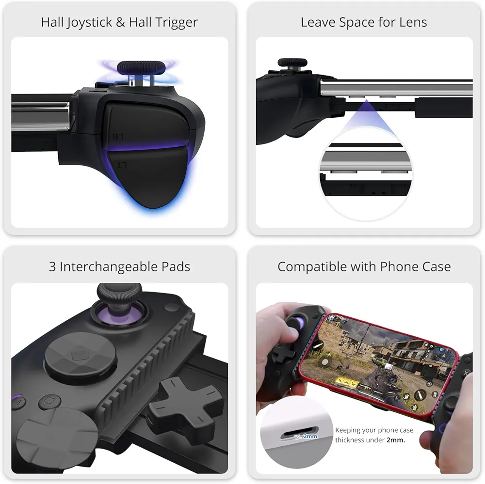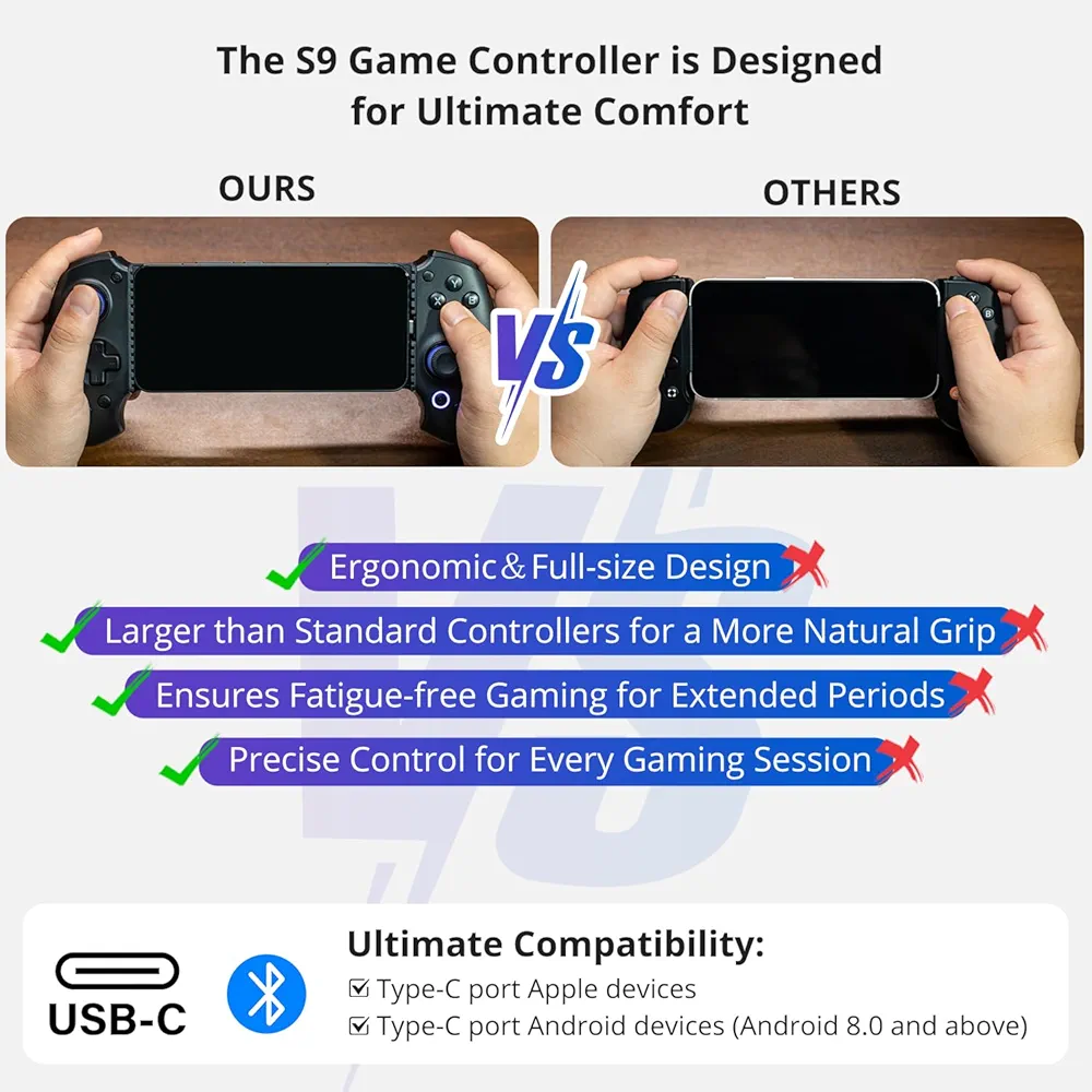 کنترلر S9 از اتصال دوگانه پشتیبانی میکند؛ یعنی هم از طریق بلوتوث و هم USB-C مستقیم میتوانید آن را به دستگاه خود وصل کنید. همچنین قابلیت شارژ همزمان حین بازی را دارد که از توقف بازی جلوگیری میکند. جویاستیکهای Hall Effect و تریگرهای حساس باعث افزایش دقت در بازیهای تیراندازی و مسابقهای میشوند. به علاوه، این کنترلر دارای اپلیکیشن اختصاصی ABXY برای تنظیم مجدد دکمهها، حساسیت و شخصیسازی کنترلهاست.