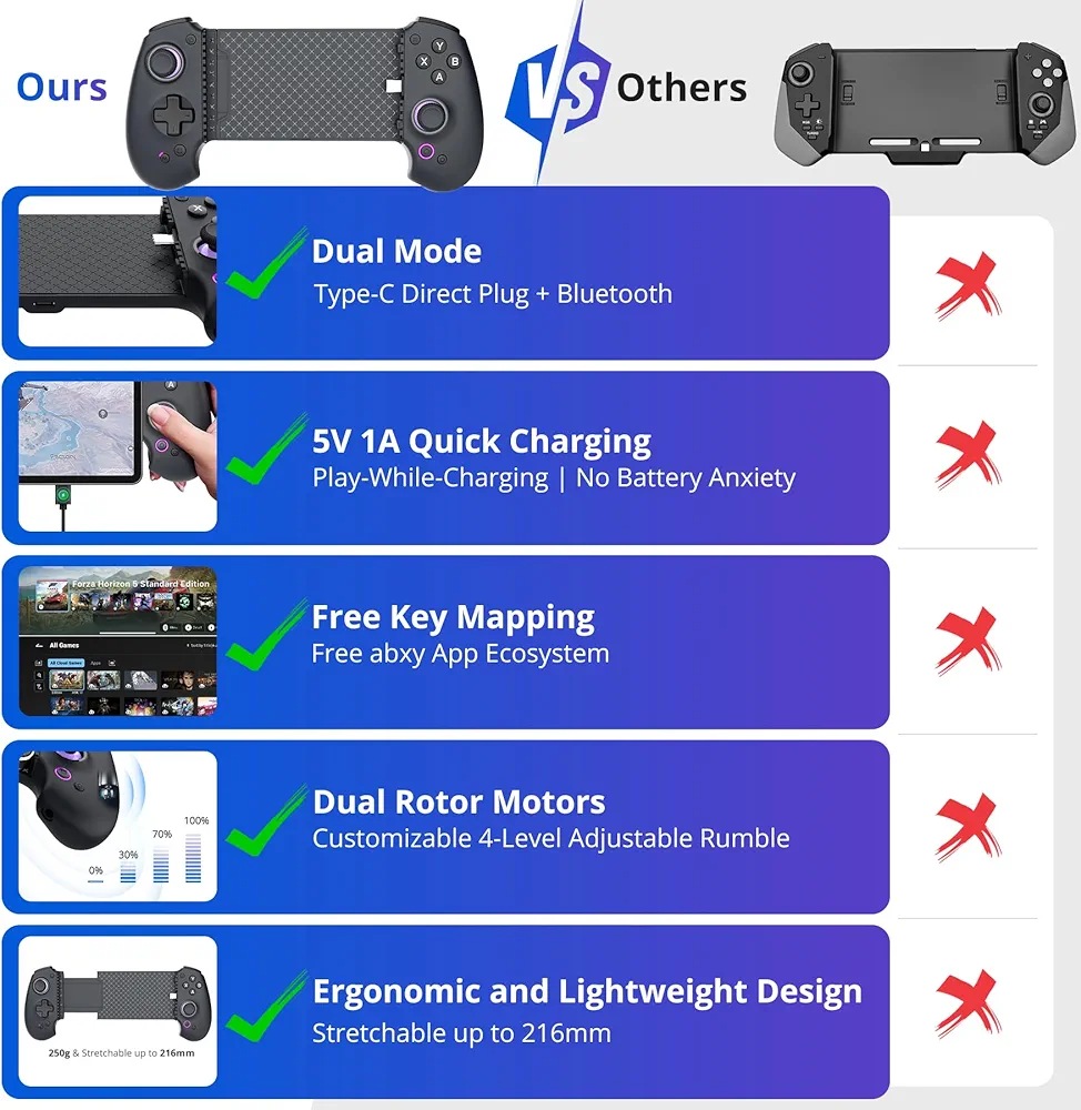 با طراحی مدرن و وزن سبک (~۲۵۰ گرم)، این کنترلر گزینهای ایدهآل برای گیمرهای موبایل حرفهای و نیمه حرفهای است. اگر به دنبال یک تجربه کنسولی واقعی روی گوشی موبایل هستید، ABXYLUTE S9 انتخابی بینظیر است.