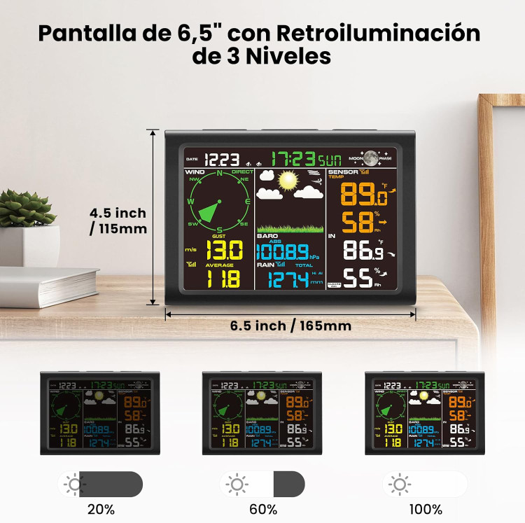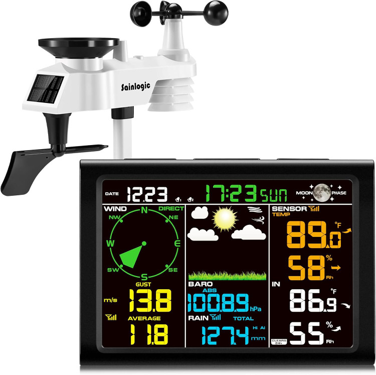Sainlogic Wireless Weather Station FT0300] یکی از کاملترین و حرفهایترین ایستگاههای هواشناسی خانگی و نیمهحرفهای است که تمامی دادههای کلیدی اقلیمی را به صورت بیسیم و در لحظه نمایش میدهد. این محصول با طراحی مدرن و صفحهنمایش LCD رنگی ۶.۵ اینچی بهگونهای ساخته شده که حتی کاربران تازهکار نیز به راحتی بتوانند آن را نصب و استفاده کنند.
