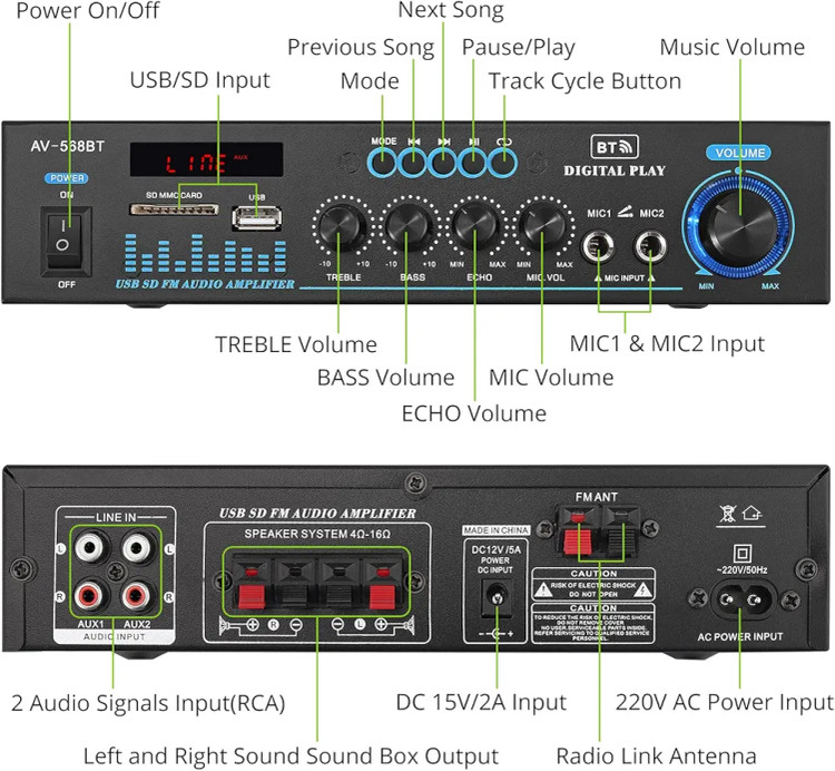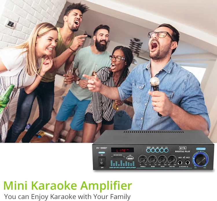 یکی از نقاط قوت LiNKFOR AV-568BT وجود دو ورودی میکروفن با تنظیم Echo است که آن را به گزینهای مناسب برای کارائوکه، مراسم کوچک، مغازهها و محیطهای نیمهحرفهای تبدیل میکند. پنل جلویی دستگاه دارای کنترلهای مستقل ولوم، باس، تریبل و میکروفن بوده و یک ریموت کنترل نیز برای مدیریت آسانتر در نظر گرفته شده است.