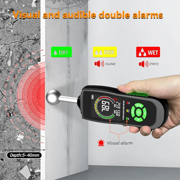 این رطوبتسنج با استفاده از فناوری Electromagnetic Wave Detection قادر است رطوبت را در متریالهایی مانند دیوار، بتن، گچ، چوب، کفپوش و سقف تشخیص دهد. نمایشگر دیجیتال رنگی دستگاه، نتایج را بهصورت عددی و گرافیکی نمایش داده و وضعیت سطح را در سه محدوده خشک (Dry)، در معرض خطر (Risk) و مرطوب (Wet) مشخص میکند. این ویژگی باعث میشود حتی کاربران غیرحرفهای نیز بتوانند بهراحتی نتایج را تفسیر کنند.