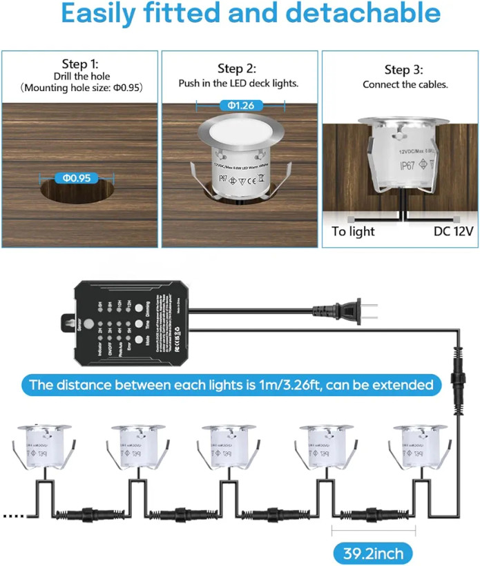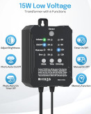 یکی از مهمترین نقاط قوت این کیت، ترانسفورماتور هوشمند با سنسور نوری (Photocell) است که بهصورت خودکار با تاریک شدن هوا چراغها را روشن و با طلوع آفتاب آنها را خاموش میکند. همچنین وجود قابلیت تایمر و دیمر (تنظیم شدت نور) به شما این امکان را میدهد که میزان روشنایی و زمان عملکرد چراغها را مطابق نیاز خود تنظیم کنید؛ موضوعی که هم در کاهش مصرف انرژی و هم در افزایش طول عمر چراغها نقش مهمی دارد.