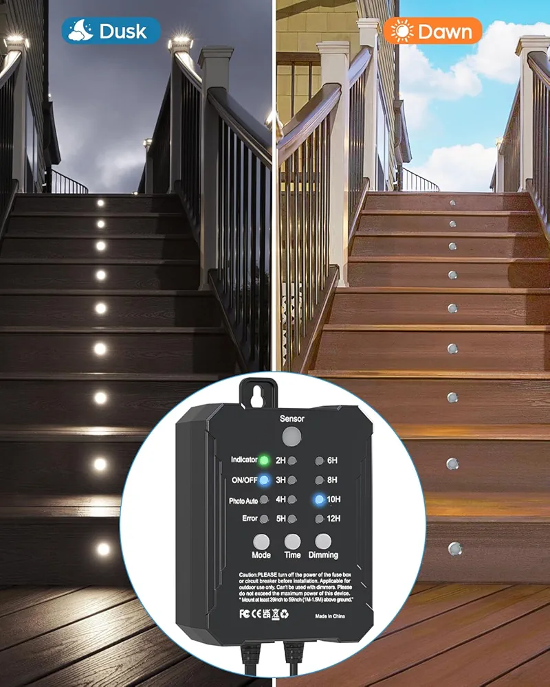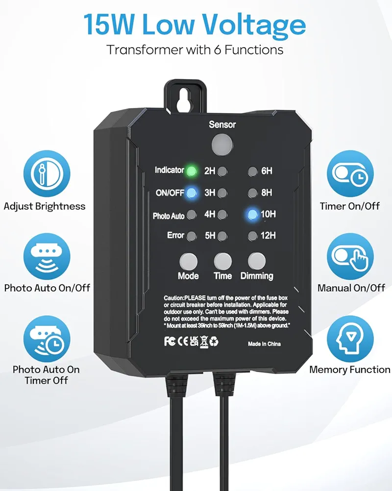 یکی از مهمترین نقاط قوت این کیت، ترانسفورماتور هوشمند با سنسور نوری (Photocell) است که بهصورت خودکار با تاریک شدن هوا چراغها را روشن و با طلوع آفتاب آنها را خاموش میکند. همچنین وجود قابلیت تایمر و دیمر (تنظیم شدت نور) به شما این امکان را میدهد که میزان روشنایی و زمان عملکرد چراغها را مطابق نیاز خود تنظیم کنید؛ موضوعی که هم در کاهش مصرف انرژی و هم در افزایش طول عمر چراغها نقش مهمی دارد.