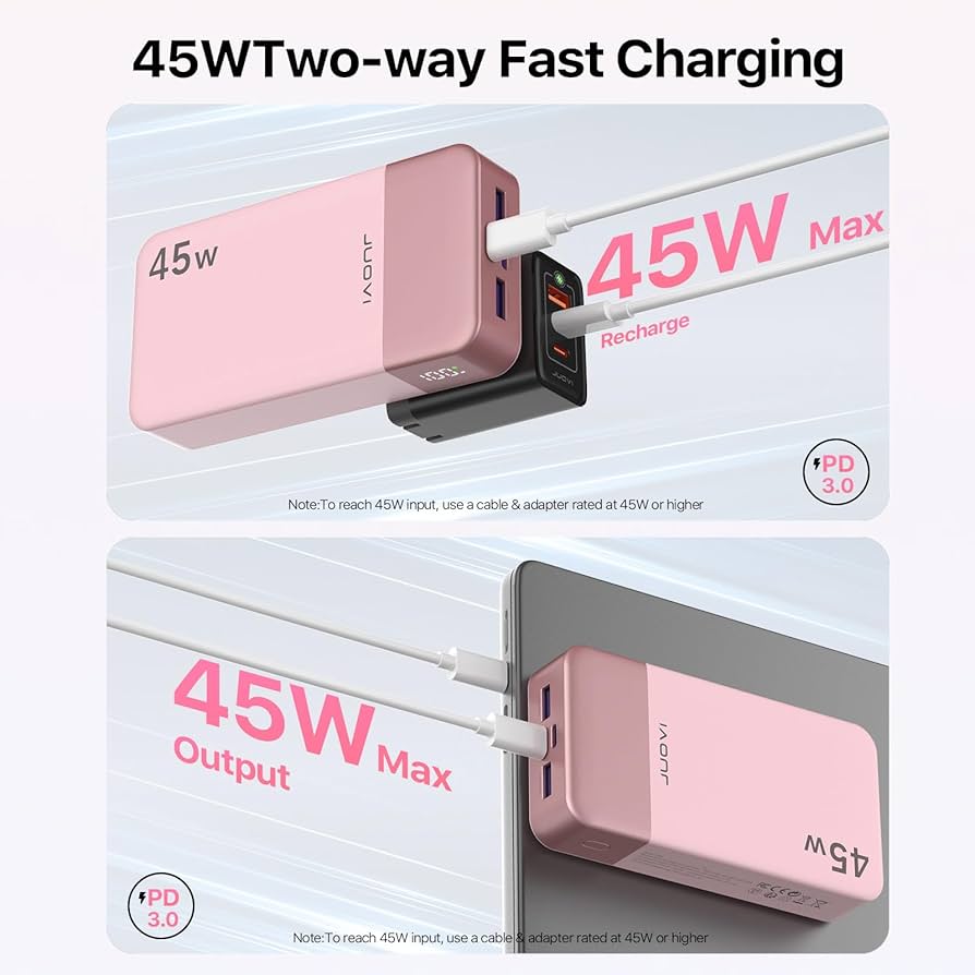پاوربانک JUOVI J2621 با ظرفیت 20000 میلیآمپر ساعت یک انتخاب حرفهای برای افرادی است که به شارژ سریع، ظرفیت بالا و سازگاری گسترده با دستگاههای دیجیتال نیاز دارند. این پاوربانک با پشتیبانی از فناوری شارژ سریع 45 وات (PD 3.0 و QC 4.0) میتواند گوشیهای هوشمند، تبلتها و حتی برخی لپتاپهای سبک مانند MacBook Air را با سرعت بالا شارژ کند.