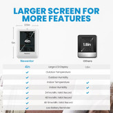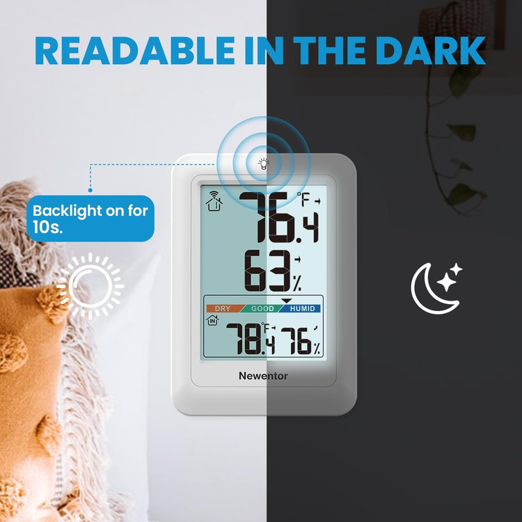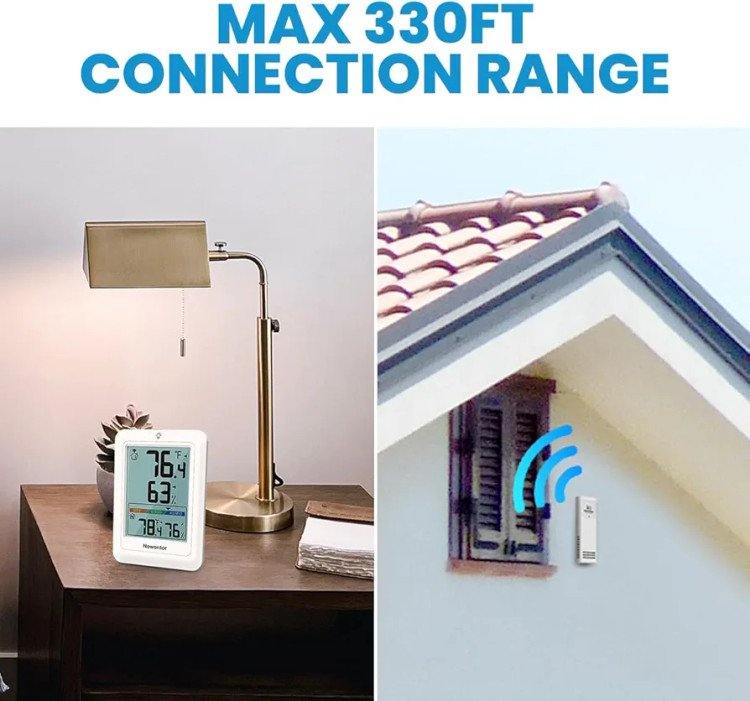 Newentor Q8 از یک نمایشگر دیجیتال واضح بهره میبرد که اطلاعات دما و رطوبت فضای داخلی و محیط بیرون را بهصورت لحظهای نمایش میدهد. سنسور بیسیم خارجی همراه دستگاه، دادهها را با برد بالا (تا حدود 100 متر در فضای باز) به واحد اصلی منتقل میکند و نیازی به سیمکشی یا نصب پیچیده ندارد.