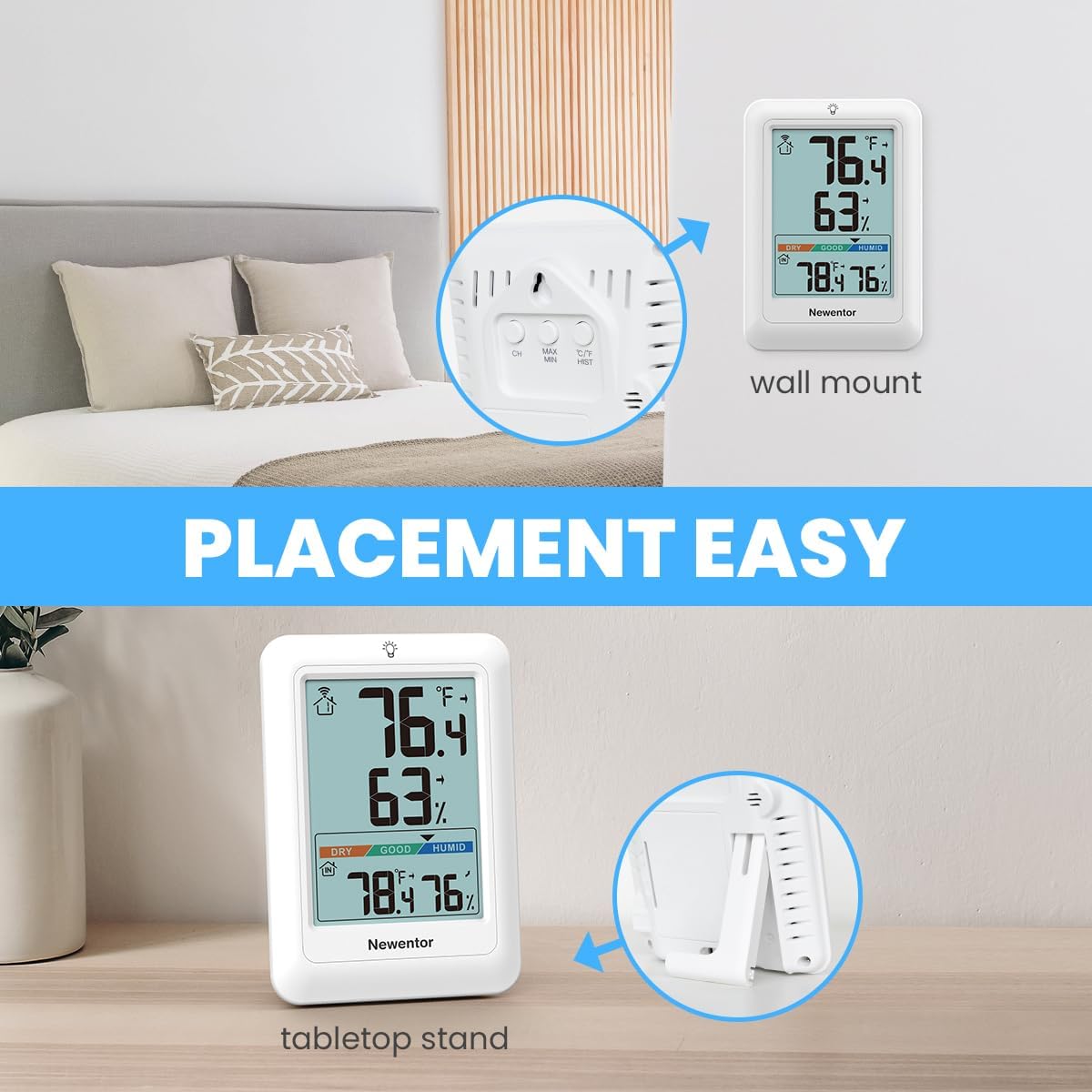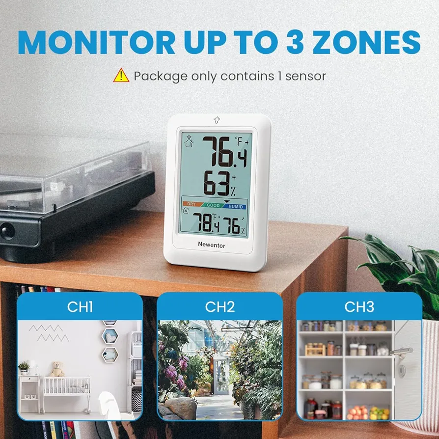 Newentor Q8 از یک نمایشگر دیجیتال واضح بهره میبرد که اطلاعات دما و رطوبت فضای داخلی و محیط بیرون را بهصورت لحظهای نمایش میدهد. سنسور بیسیم خارجی همراه دستگاه، دادهها را با برد بالا (تا حدود 100 متر در فضای باز) به واحد اصلی منتقل میکند و نیازی به سیمکشی یا نصب پیچیده ندارد.