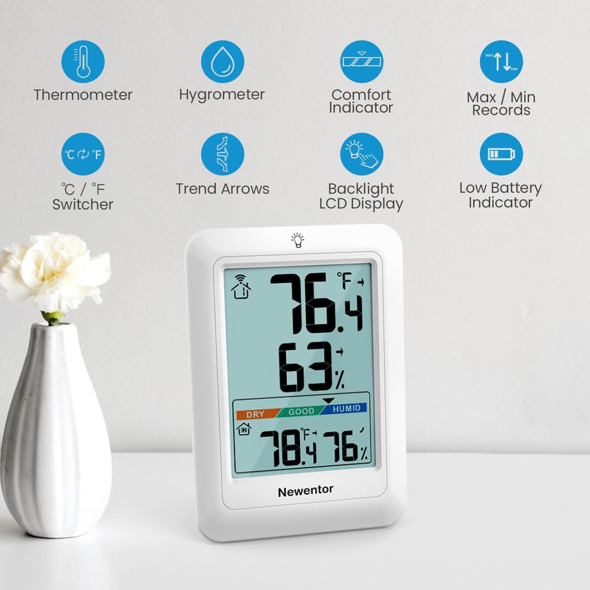 اگر بهدنبال یک دماسنج و رطوبتسنج بیسیم با نصب آسان، نمایشگر خوانا و عملکرد پایدار هستید، Newentor Q8 WHITE میتواند انتخابی هوشمندانه برای شما باشد.