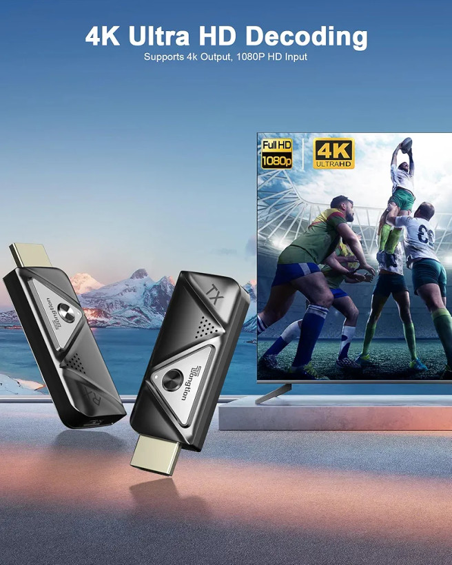 این دانگل HDMI وایرلس از کیفیت Full HD 1080P@60Hz پشتیبانی میکند و با قابلیت 4K Decode، تصویری شفاف، روان و بدون پرش ارائه میدهد ✨. استفاده از فناوری انتقال دو بانده 2.4GHz و 5GHz باعث کاهش نویز و افزایش پایداری سیگنال شده و امکان انتقال تصویر تا ۳۰ متر را فراهم میکند 📶.