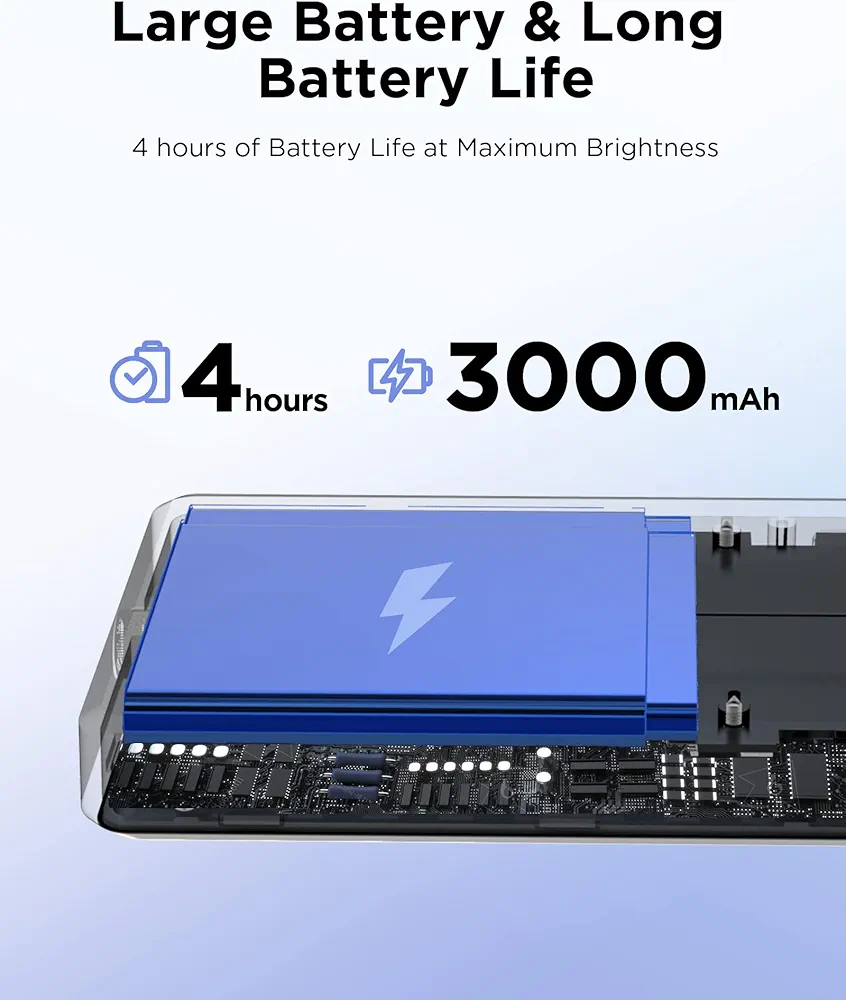 در حدود 4 ساعت بسته به شدت نور. باتری 3000mAh امکان استفاده طولانی را فراهم میکند.