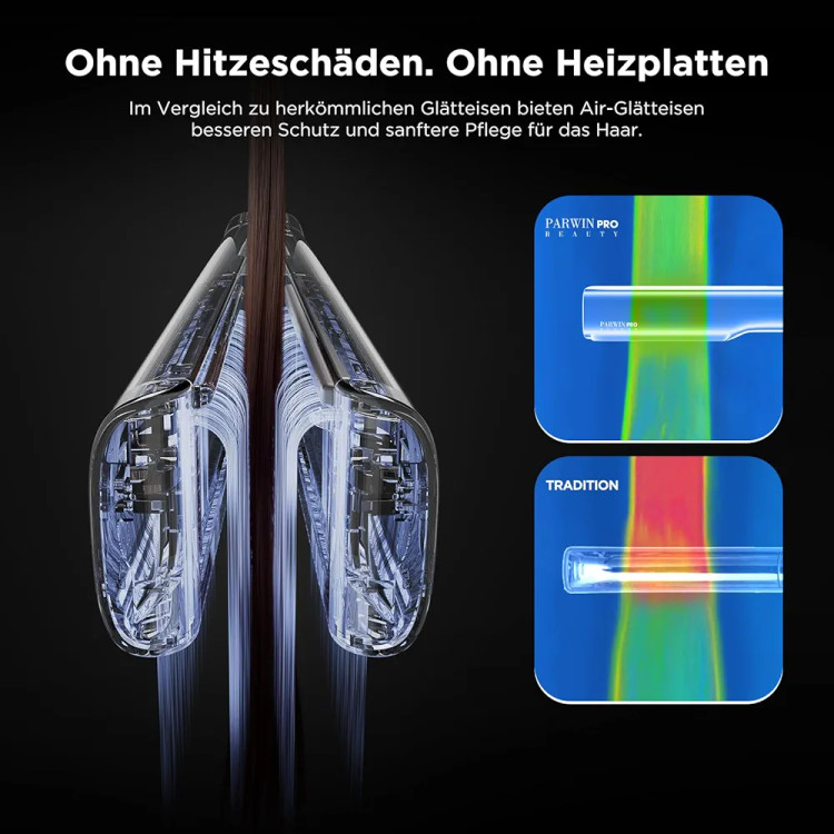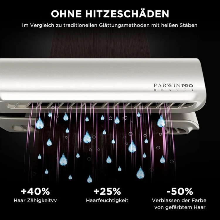 Parwin Pro Beauty Ionen Air Glätteisen AB0333 یکی از پیشرفتهترین ابزارهای آرایشی برای صاف کردن و حالتدهی موهاست که با بهرهگیری از فناوری هوای داغ + یونهای منفی (Ionic Technology) طراحی شده است. این دستگاه نهتنها موها را صاف میکند، بلکه در حین کار از وز شدن و آسیب دیدن تارهای مو جلوگیری مینماید و ظاهری صاف، براق و سالم به موها میبخشد.
