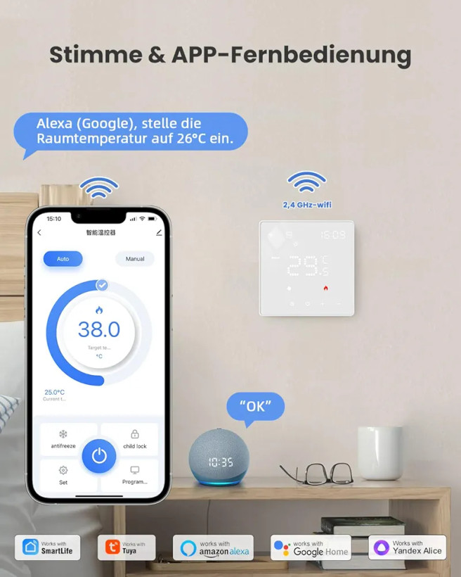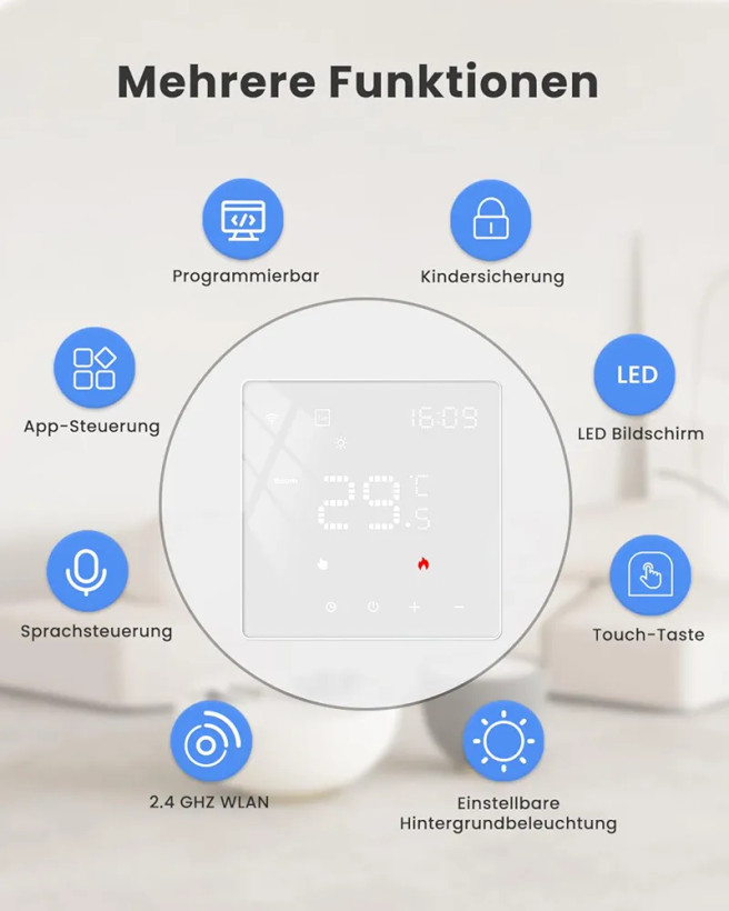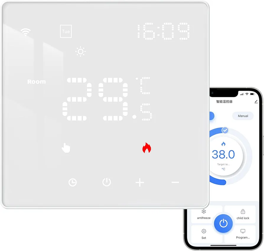 ترموستات هوشمند گرمایش از کف یک کنترلکننده دیجیتال پیشرفته است که برای سیستمهای گرمایش از کف الکتریکی طراحی شده و امکان تنظیم دقیق دما، کنترل از راه دور، برنامهریزی هفتگی و هماهنگی با دستیارهای صوتی هوشمند را فراهم میکند. این ترموستات با اتصال Wi-Fi و پشتیبانی از برنامههای محبوب مانند Smart Life یا Tuya، تجربهای بینظیر از مدیریت دما را برای خانههای مدرن به ارمغان میآورد. �