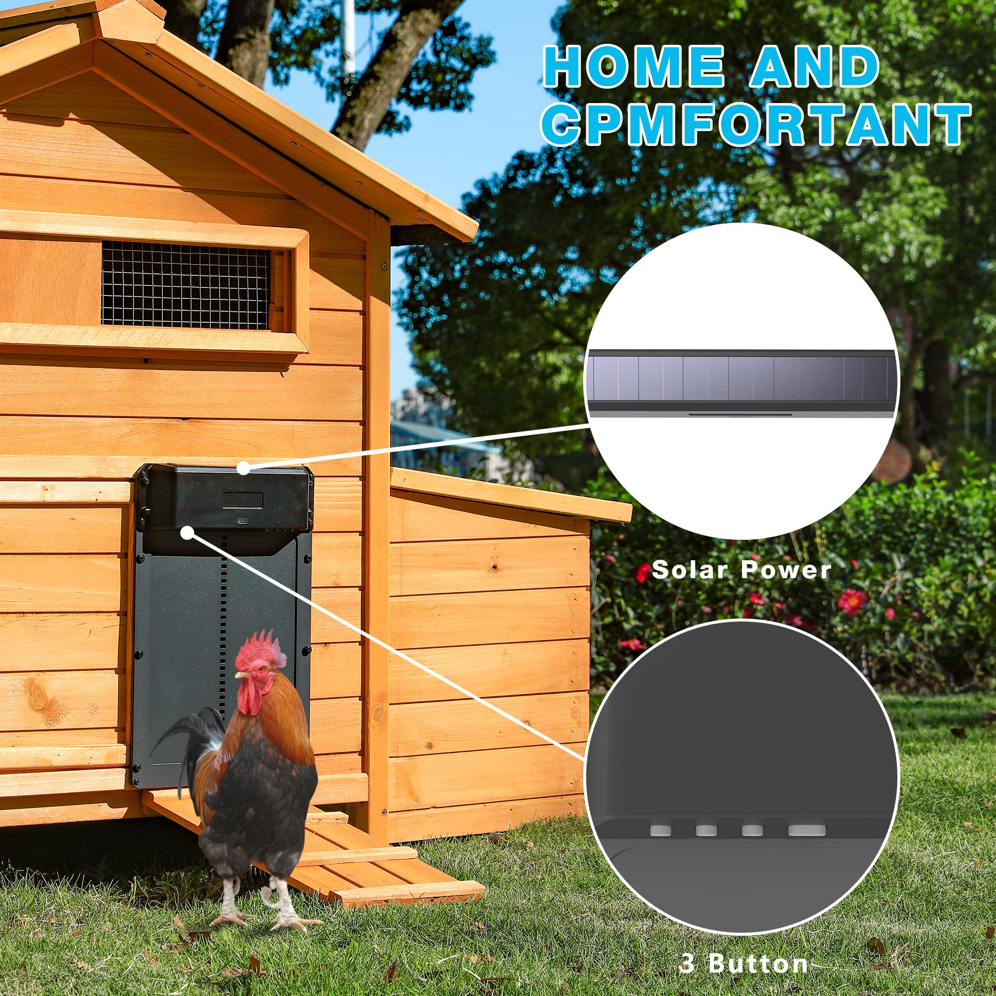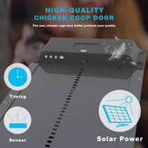 بدنهی آلومینیومی ضدزنگ و مقاوم در برابر رطوبت، باران و گردوغبار، این محصول را به گزینهای ایدهآل برای استفاده در فضای باز و شرایط آبوهوایی مختلف تبدیل کرده است. بسته شدن خودکار در شب، از ورود حیوانات شکارچی مانند روباه، سگ یا گربه جلوگیری کرده و امنیت گله را بهطور چشمگیری افزایش میدهد.