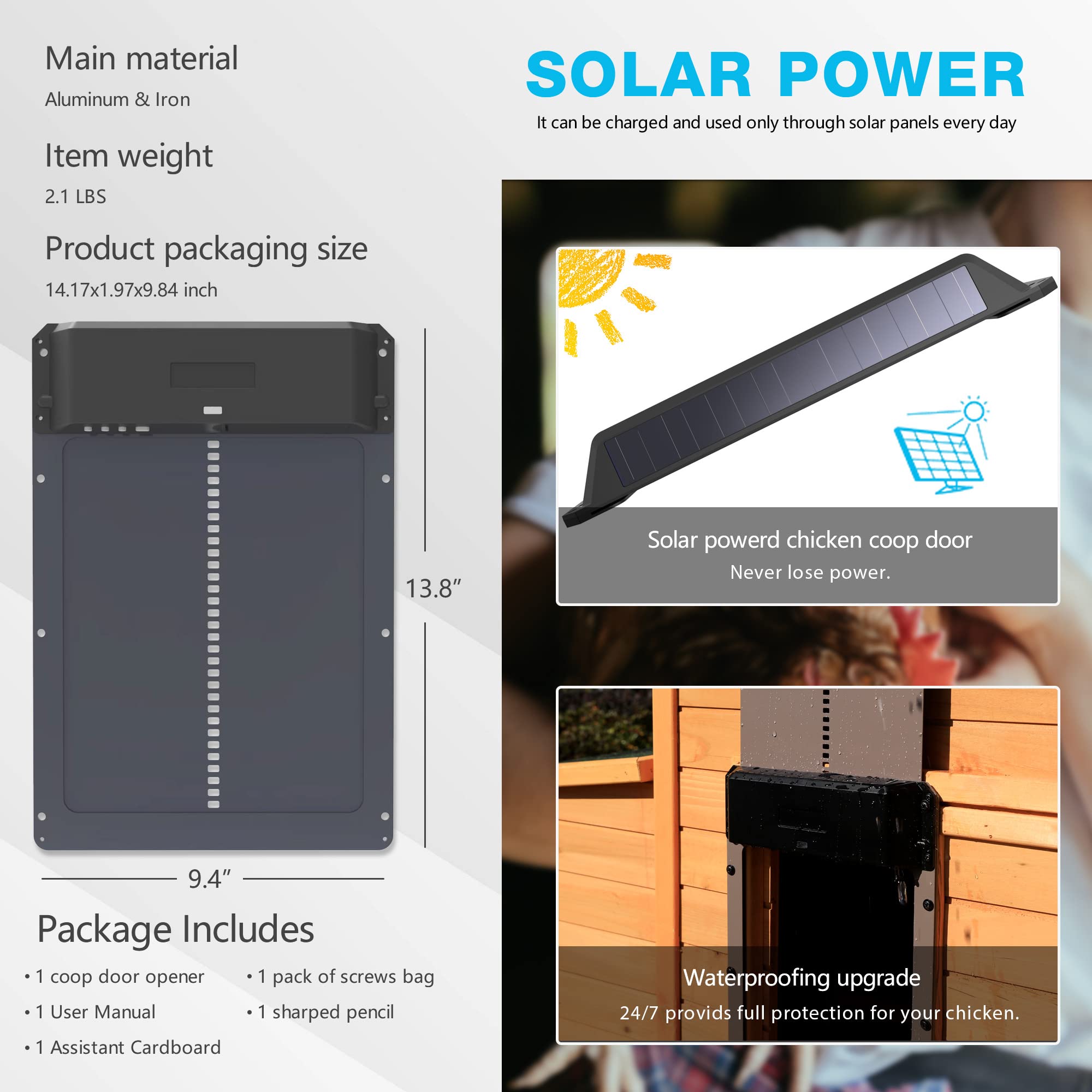بدنهی آلومینیومی ضدزنگ و مقاوم در برابر رطوبت، باران و گردوغبار، این محصول را به گزینهای ایدهآل برای استفاده در فضای باز و شرایط آبوهوایی مختلف تبدیل کرده است. بسته شدن خودکار در شب، از ورود حیوانات شکارچی مانند روباه، سگ یا گربه جلوگیری کرده و امنیت گله را بهطور چشمگیری افزایش میدهد.