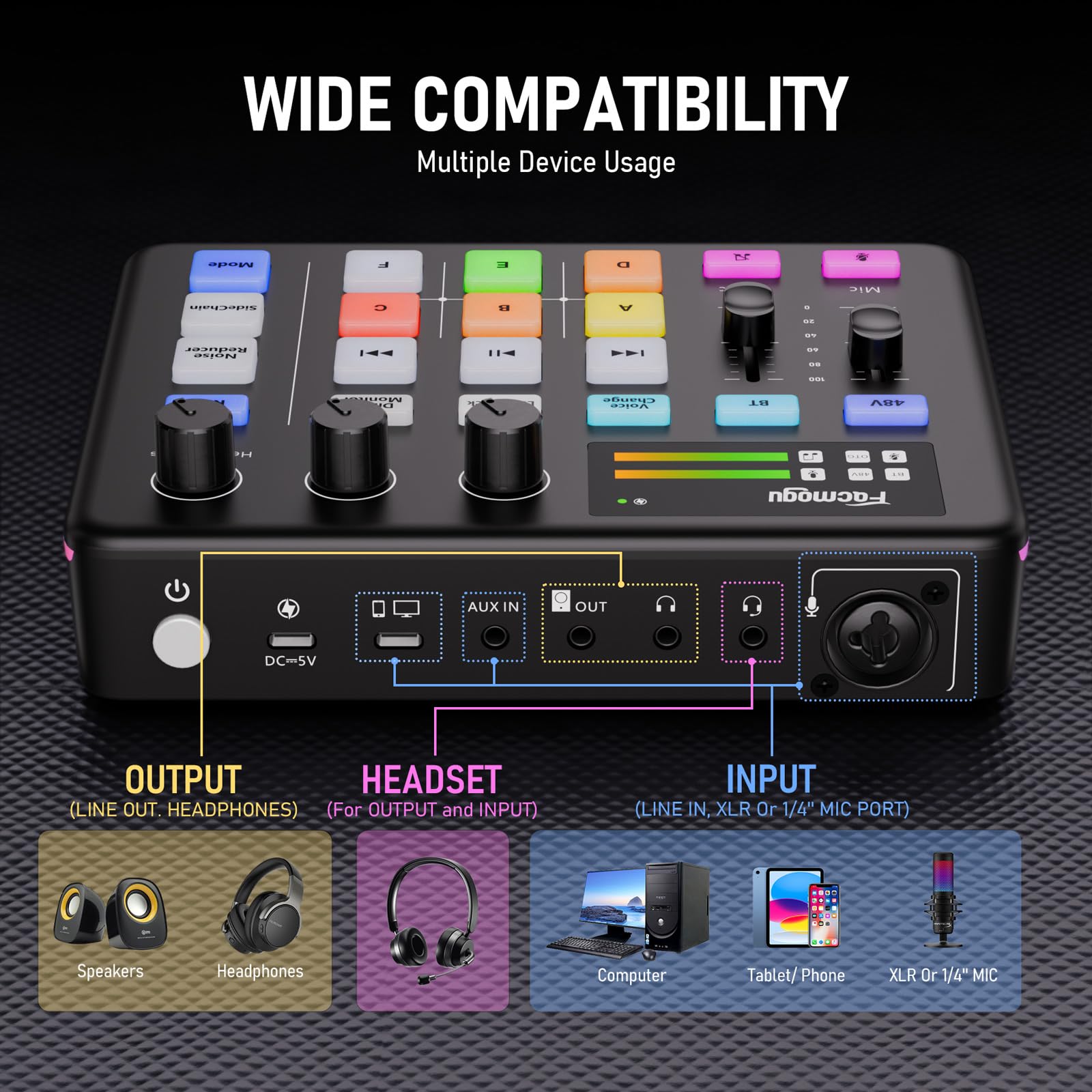 Facmogu G9 از ورودی میکروفن XLR و 3.5 میلیمتری پشتیبانی میکند و با داشتن فانتوم پاور 48V، امکان استفاده از میکروفنهای کاندنسر حرفهای را فراهم میسازد. این ویژگی آن را به گزینهای ایدهآل برای ضبط وکال، پادکست و لایو استریم تبدیل میکند. توجه داشته باشید که این دستگاه از میکروفنهای USB پشتیبانی نمیکند.