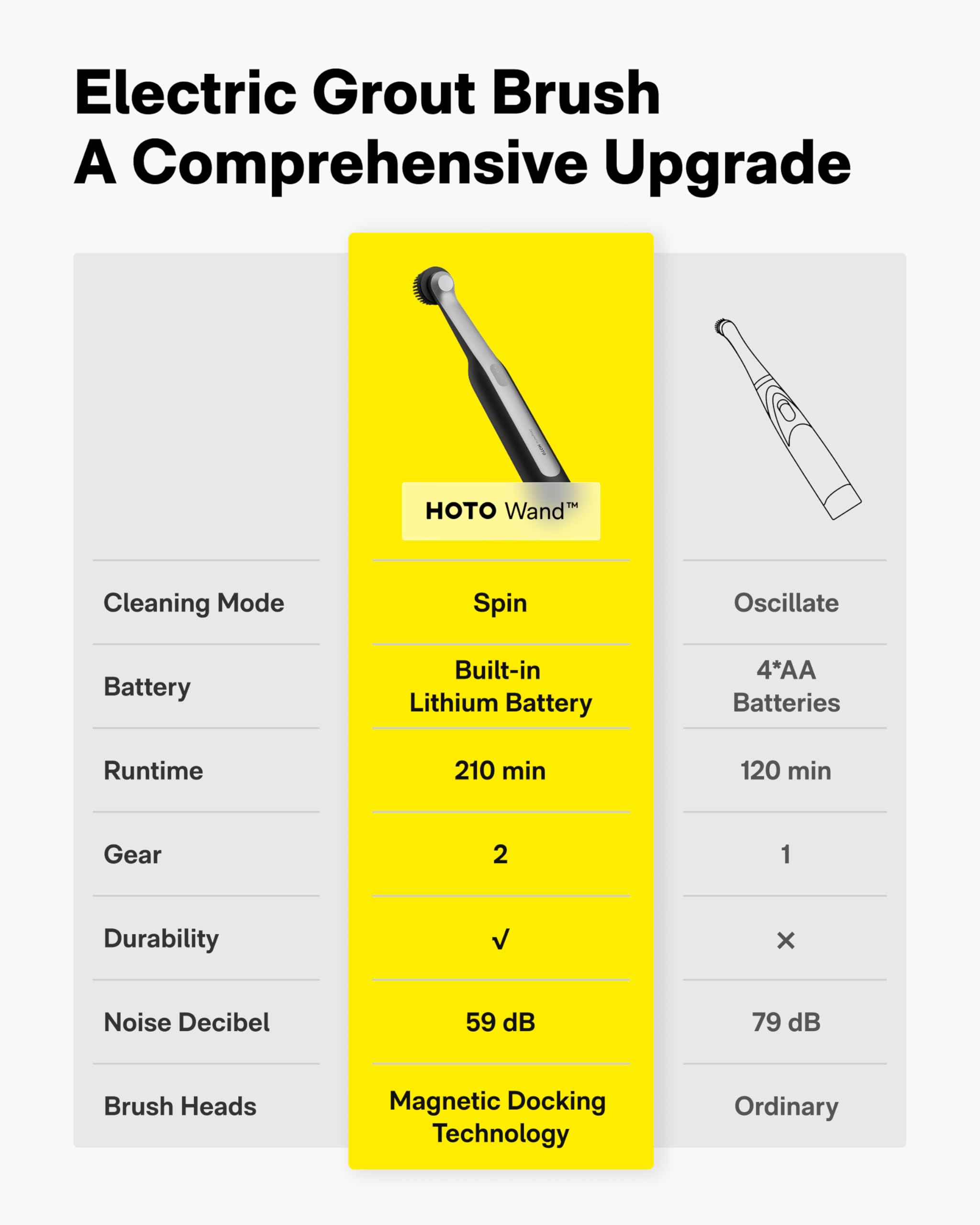 بدنه ضدآب و مقاوم برس نظافت برقی HOTO، امکان شستوشوی آسان و استفاده ایمن در محیطهای مرطوب را فراهم میکند. طراحی خوشدست آن باعث میشود حتی در استفاده طولانیمدت نیز دست خسته نشود. همچنین وزن متعادل دستگاه، کنترل کامل حین نظافت را تضمین میکند.