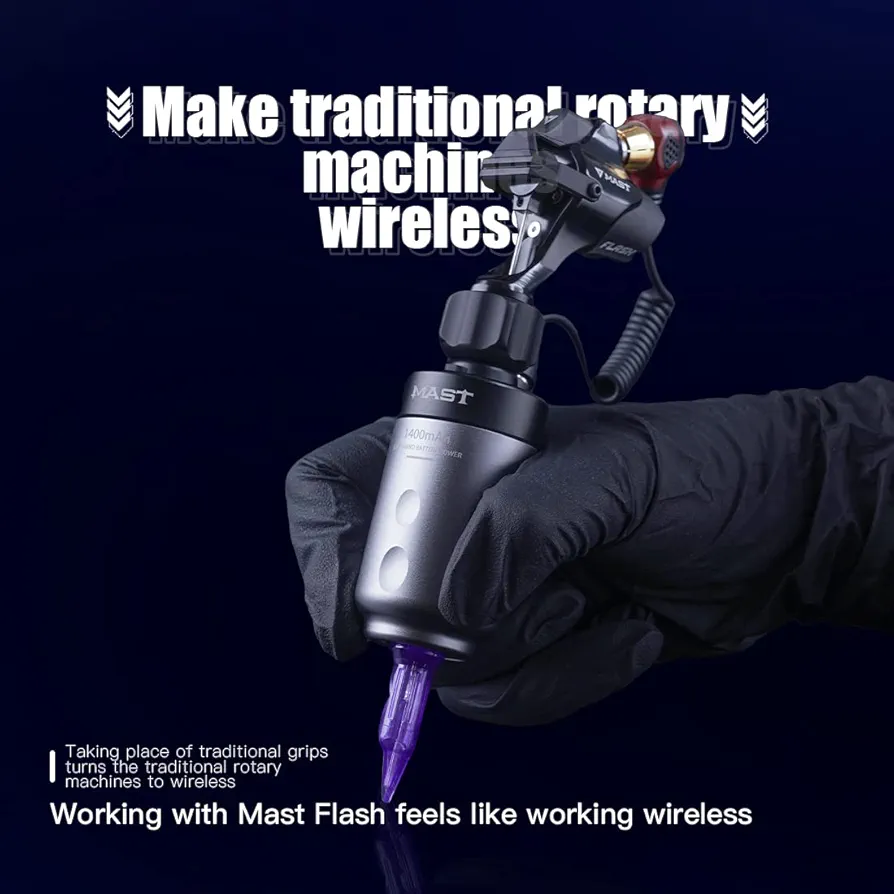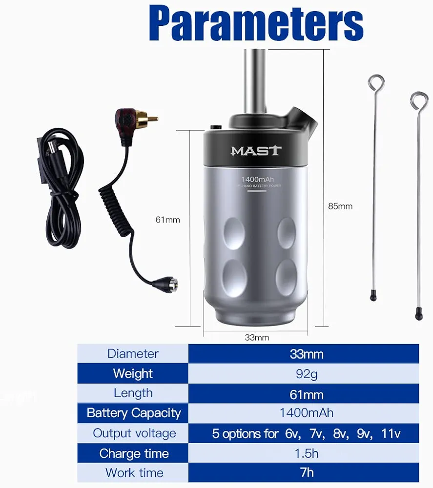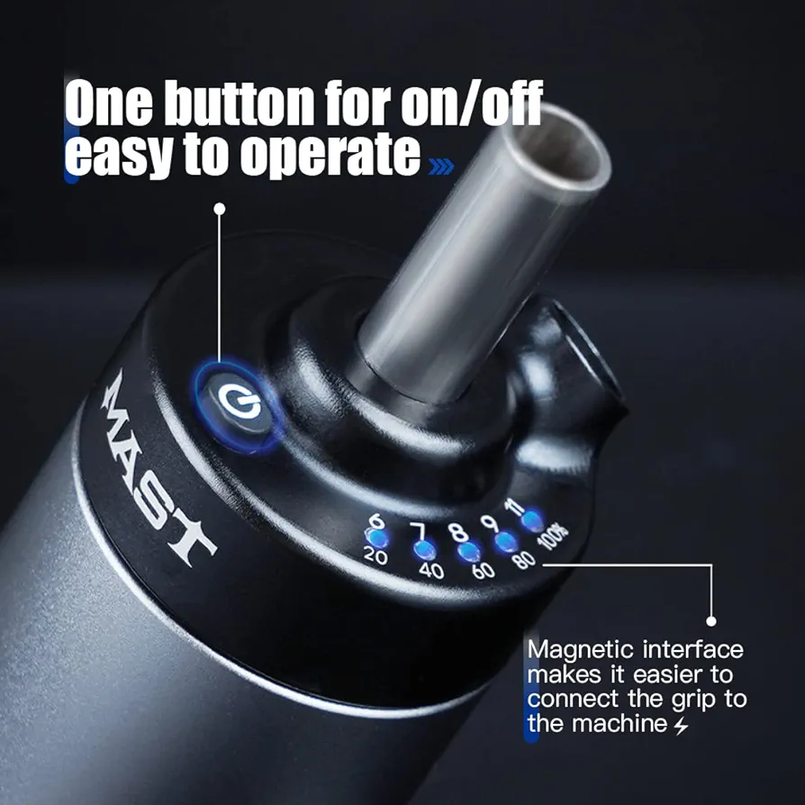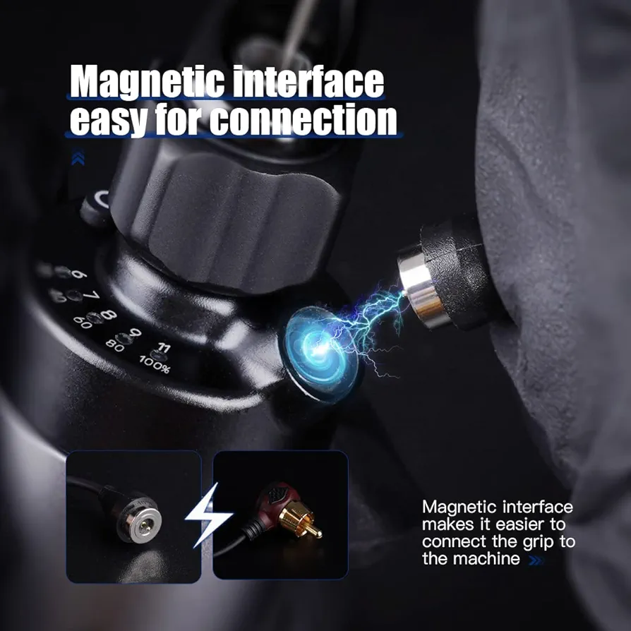 این باتری وایرلس بهراحتی به دستگاههای تاتو پن روتاری با اتصال RCA متصل میشود و با ولتاژ قابل تنظیم، امکان اجرای انواع سبکهای تاتو از لاینورک ظریف تا شیدینگ و بلکورک را فراهم میکند. وجود نمایشگر LED دیجیتال روی بدنه، کنترل دقیق ولتاژ و مدیریت بهتر انرژی را برای کاربر ممکن میسازد.
