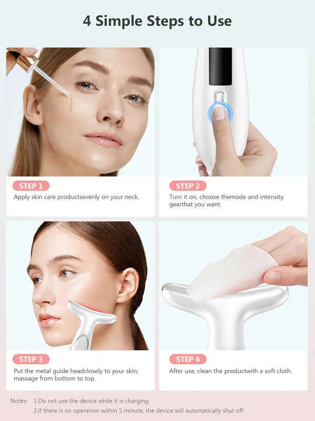 این دستگاه لیفتینگ ماساژور صورت و گردن با بهرهگیری از EMS (الکترو میکروکارنت)، ماساژ با فرکانس بالا، نور درمانی LED در ۴ رنگ و عملکرد گرم ۴۵ °C و سرد ۵ °C، بهصورت همزمان چندین نیاز پوستی را هدف قرار میدهد. نور قرمز باعث افزایش فعالیت سلولی و کلاژنسازی میشود، نور سبز به کاهش التهابات کمک میکند، نور آبی با پوستهای مستعد آکنه سازگار است و نور نارنجی موجب بهبود خطوط ریز میشود. حالت سرد (۵ °C) برای کاهش تورم، آرامسازی پوست و جمعکردن منافذ موثر است، در حالی که گرما (۴۵ °C) همراه با ماساژ به تقویت جذب محصولات مراقبتی کمک میکند. �