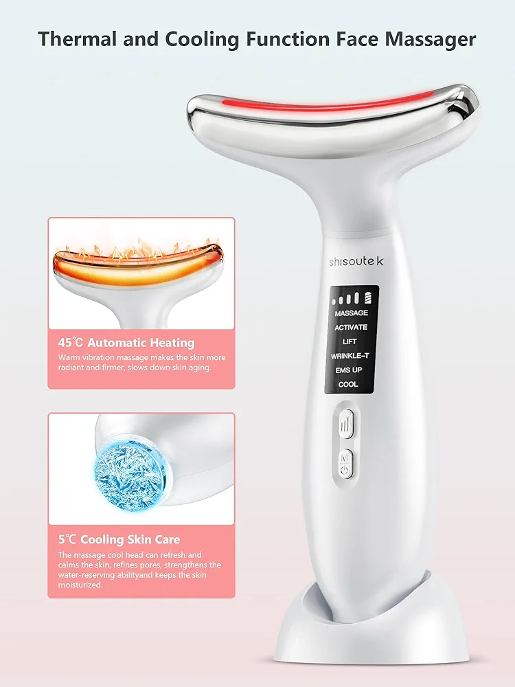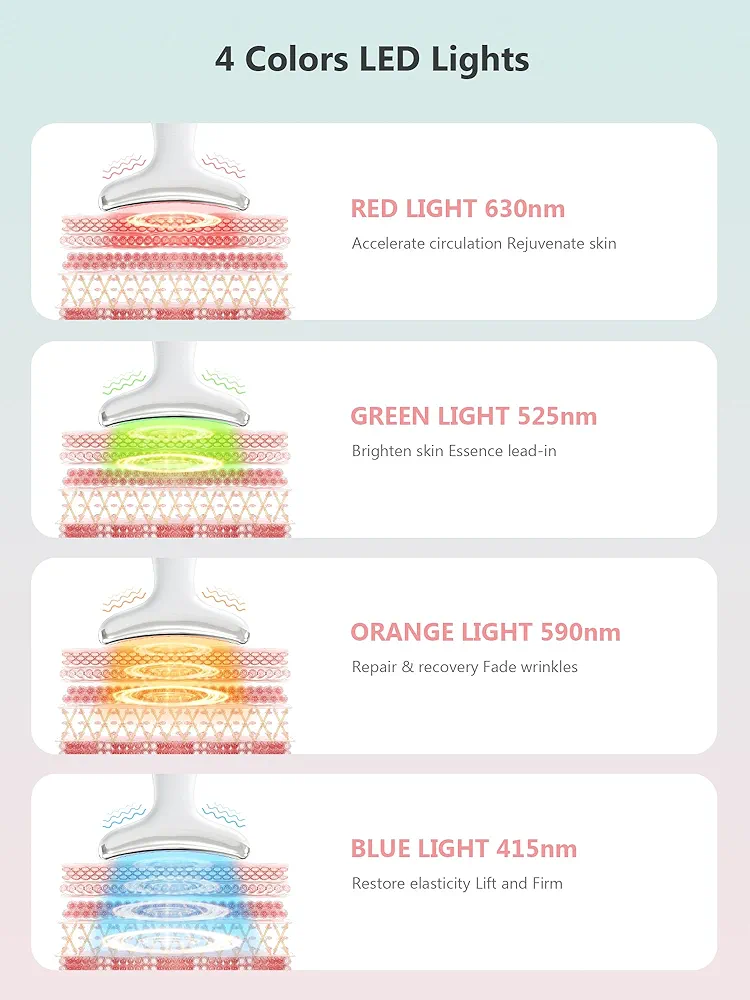 این دستگاه لیفتینگ ماساژور صورت و گردن با بهرهگیری از EMS (الکترو میکروکارنت)، ماساژ با فرکانس بالا، نور درمانی LED در ۴ رنگ و عملکرد گرم ۴۵ °C و سرد ۵ °C، بهصورت همزمان چندین نیاز پوستی را هدف قرار میدهد. نور قرمز باعث افزایش فعالیت سلولی و کلاژنسازی میشود، نور سبز به کاهش التهابات کمک میکند، نور آبی با پوستهای مستعد آکنه سازگار است و نور نارنجی موجب بهبود خطوط ریز میشود. حالت سرد (۵ °C) برای کاهش تورم، آرامسازی پوست و جمعکردن منافذ موثر است، در حالی که گرما (۴۵ °C) همراه با ماساژ به تقویت جذب محصولات مراقبتی کمک میکند. �