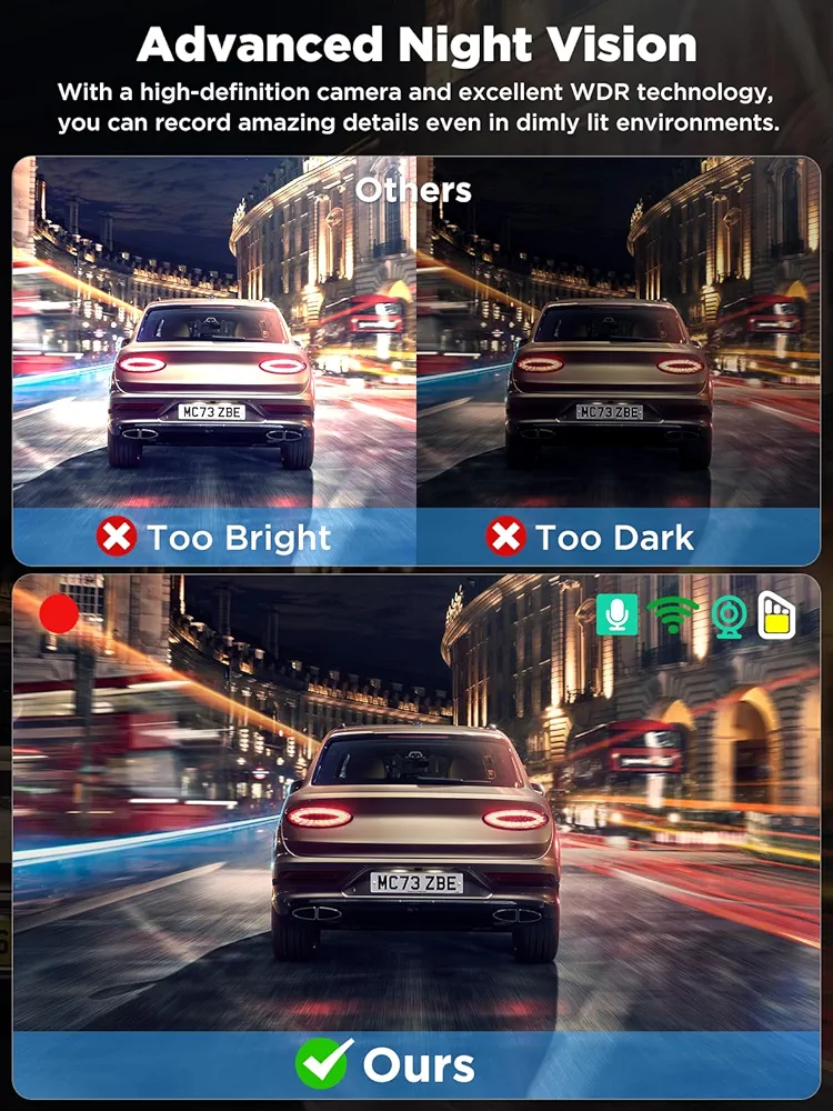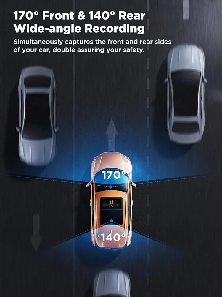 زاویه دید عریض ۱۷۰ درجه در جلو و ۱۴۰ درجه در عقب باعث میشود تا پوشش کاملی از مسیر داشته باشید. همچنین با وجود لنز ششلایه و گشادگی دیافراگم F1.8، عملکرد عالی در شب و نور کم را تجربه خواهید کرد. قابلیتهای مهمی همچون G-Sensor (حسگر ضربه) برای قفل خودکار ویدیو هنگام تصادف، Loop Recording (ضبط حلقوی) برای حذف خودکار فایلهای قدیمی، و WDR برای تعادل نوری، این دستگاه را به یکی از گزینههای ایدهآل برای رانندگان حرفهای تبدیل کرده است.