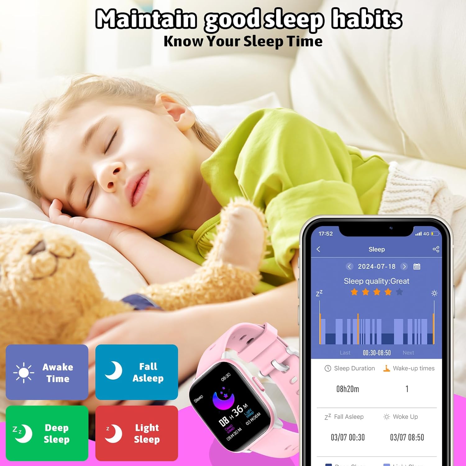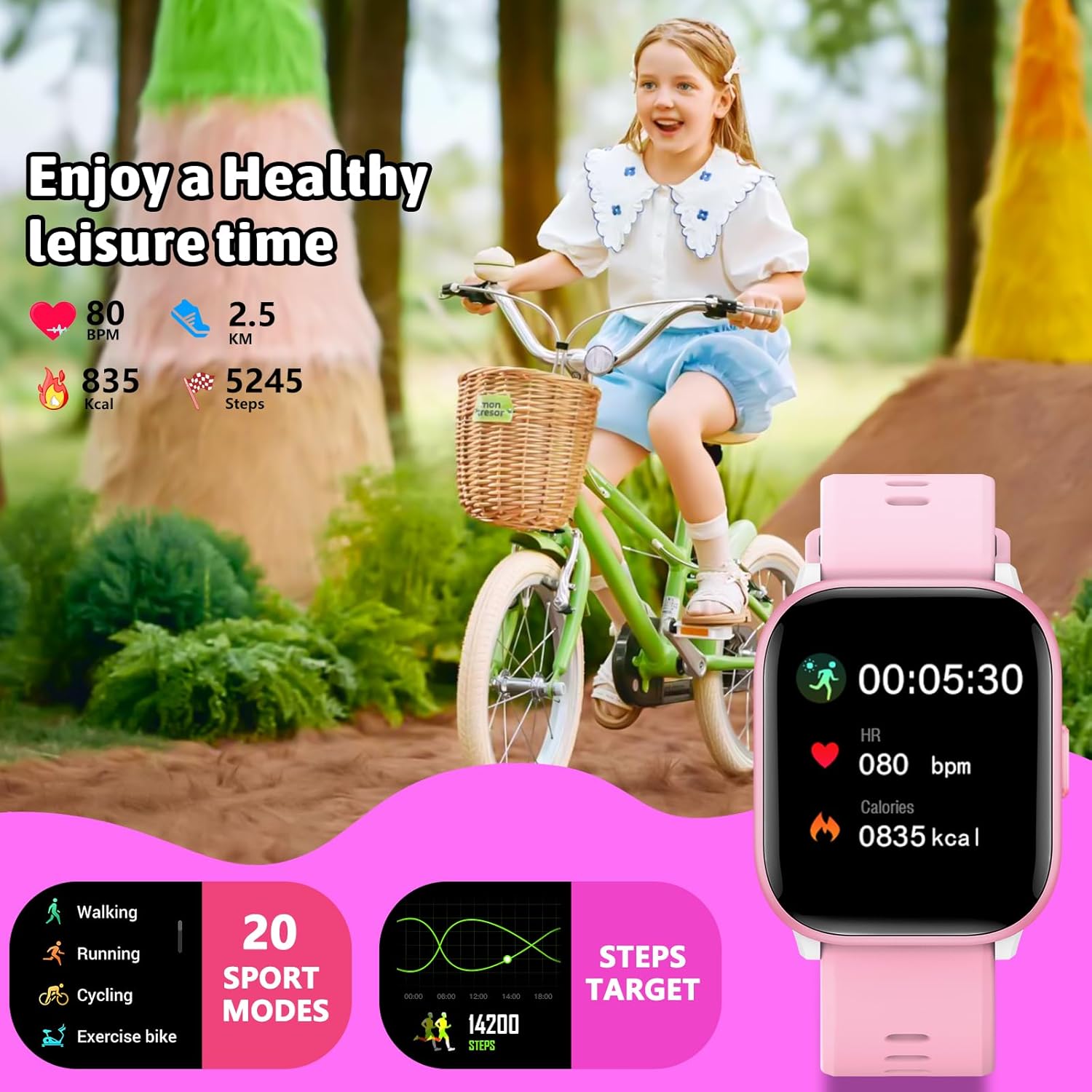 این مدل با داشتن ۲۰ حالت ورزشی مختلف (از جمله دویدن، پیادهروی، دوچرخهسواری و طنابزنی) امکان ثبت دقیق گامها، مسافت پیمودهشده و کالری مصرفی را فراهم میکند. همچنین با سنسورهای پایش خواب و ضربان قلب، کیفیت خواب و سلامت عمومی کودک را بررسی میکند.