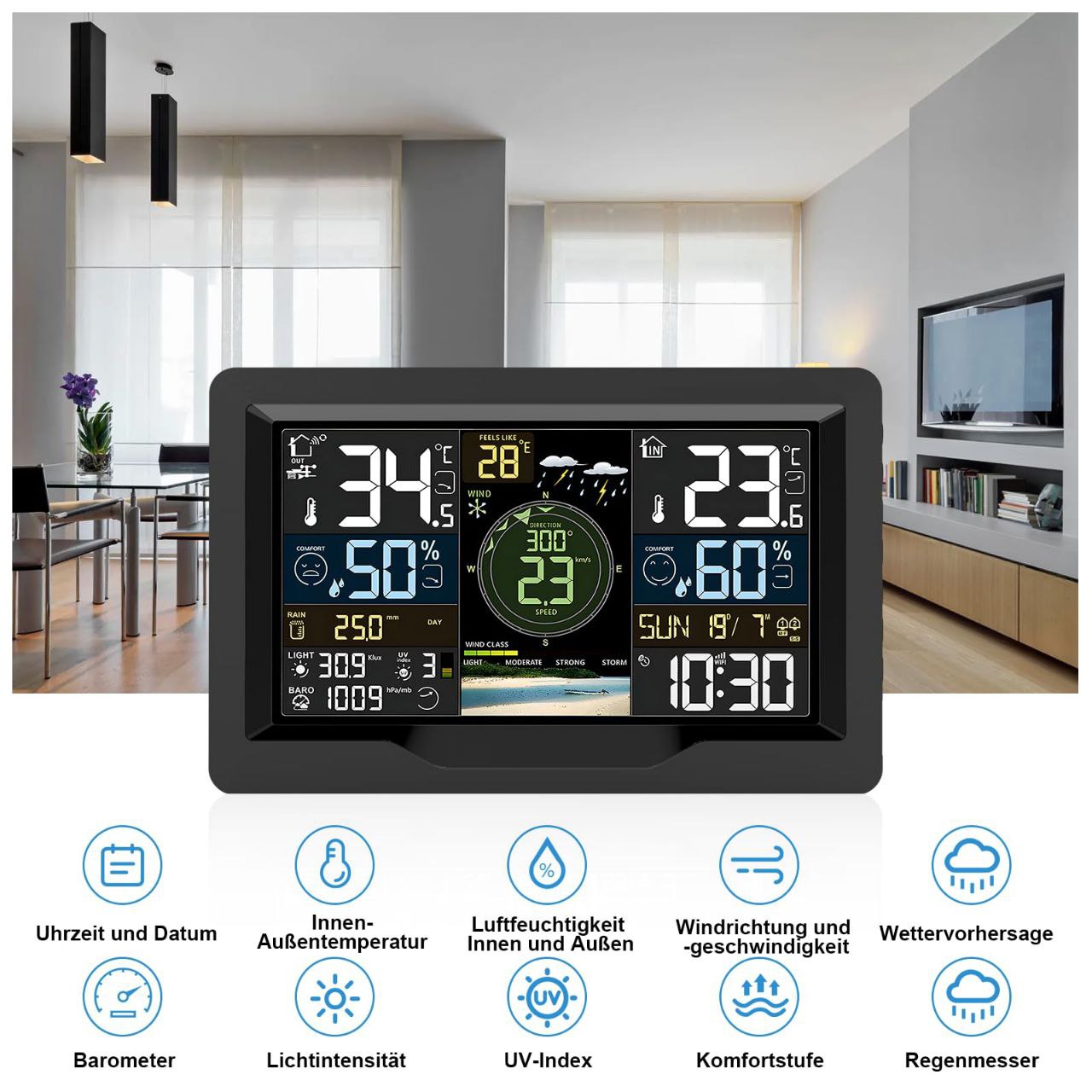 ایستگاه هواشناسی بیسیم EM3390TY یک دستگاه هوشمند و دقیق برای پایش وضعیت آبوهوا در محیطهای داخلی و خارجی است. این محصول با طراحی مدرن و نمایشگر تمامرنگی، اطلاعاتی مانند دما، رطوبت، فشار هوا، سرعت و جهت باد، میزان بارندگی و شاخص راحتی را بهصورت لحظهای نمایش میدهد.