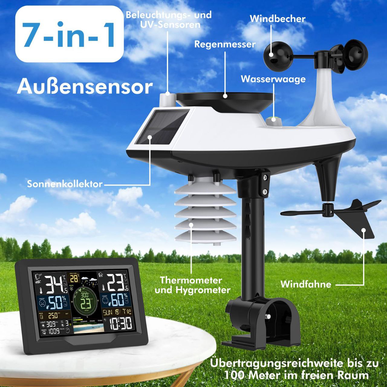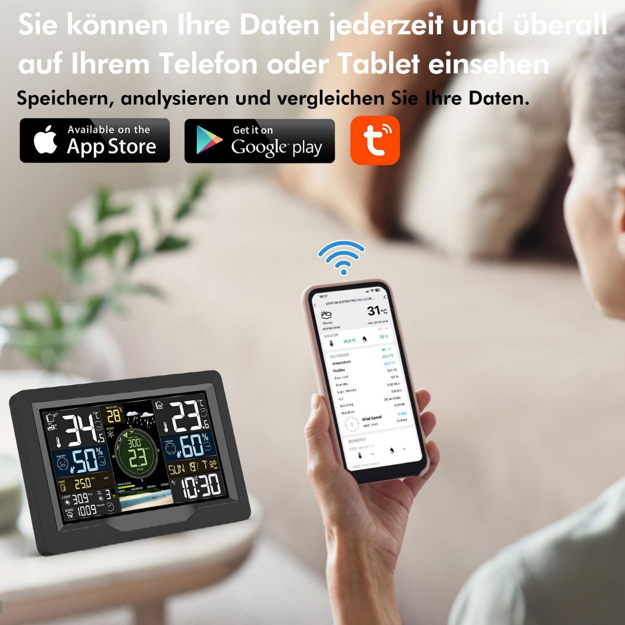 سنسور بیرونی این دستگاه با انرژی خورشیدی کار میکند و از طریق ارتباط Wi-Fi و RF دادهها را به نمایشگر اصلی و اپلیکیشن موبایل منتقل میکند. بهاینترتیب میتوانید در هر زمان و مکان از طریق گوشی هوشمند خود شرایط دقیق آبوهوایی را بررسی کنید.