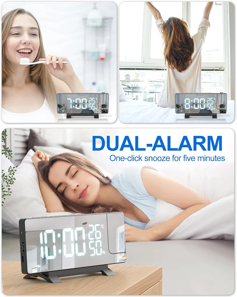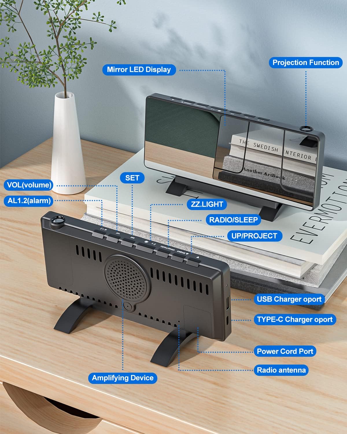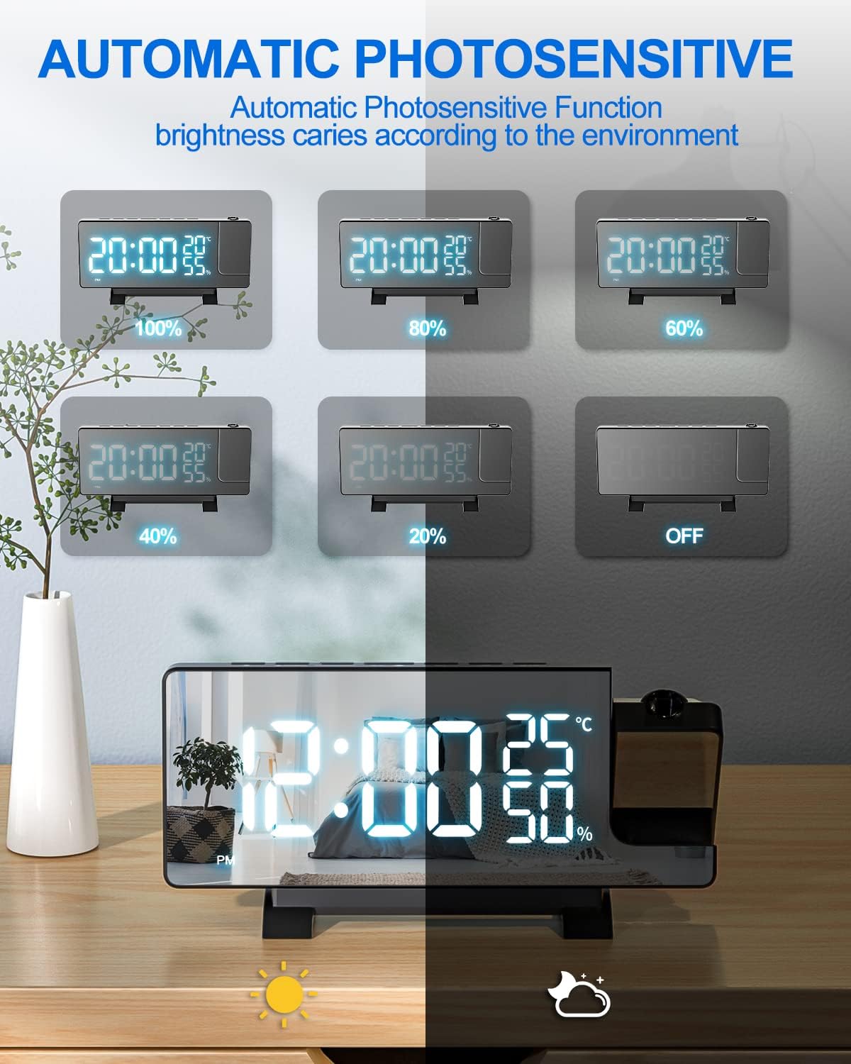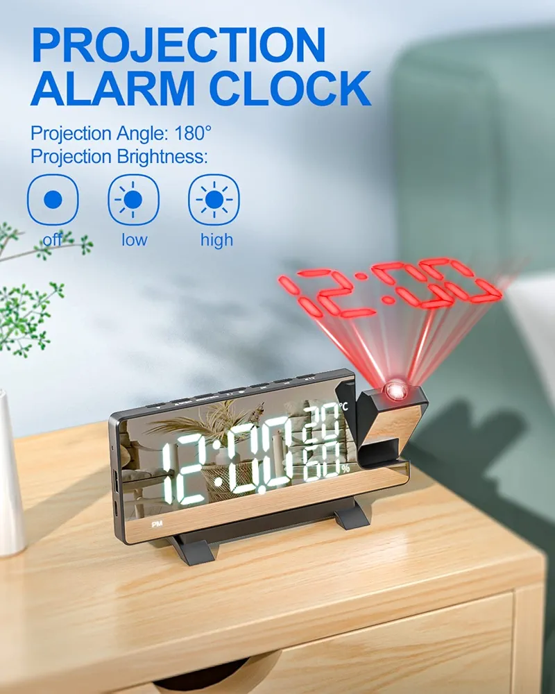 یکی از ویژگیهای متمایز این محصول، قابلیت پروژکشن ۱۸۰ درجهای است که زمان را روی دیوار یا سقف بهصورت واضح نمایش میدهد. این قابلیت باعث میشود بدون نیاز به بلند شدن از تخت، ساعت را در هر لحظه مشاهده کنید. همچنین امکان تنظیم روشنایی در ۳ سطح مختلف برای نور پروژکتور و ۵ سطح برای نمایشگر اصلی، تجربهای راحت و متناسب با شرایط نوری محیط فراهم میکند.