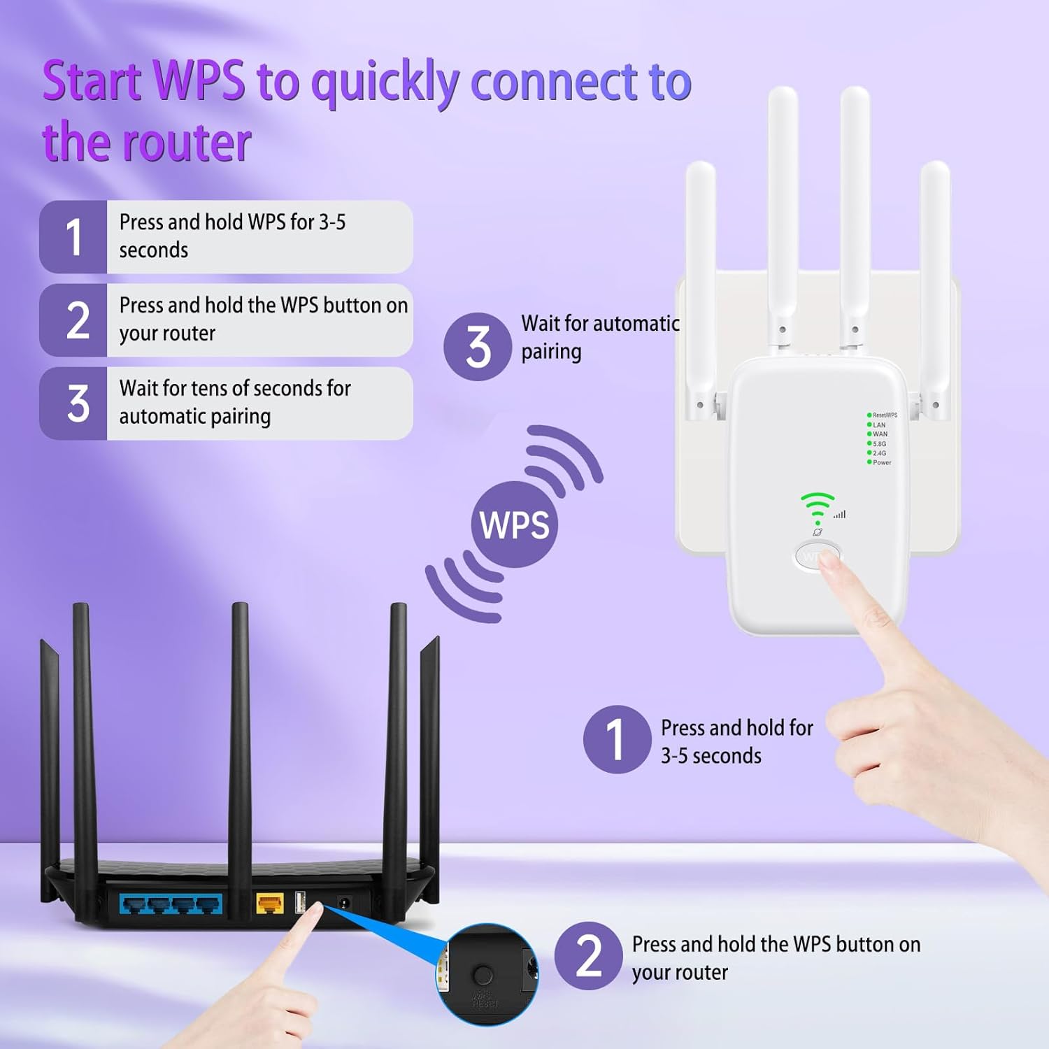 با فشردن دکمه WPS روی روتر و دستگاه، اتصال خودکار در کمتر از 2 دقیقه انجام میشود.