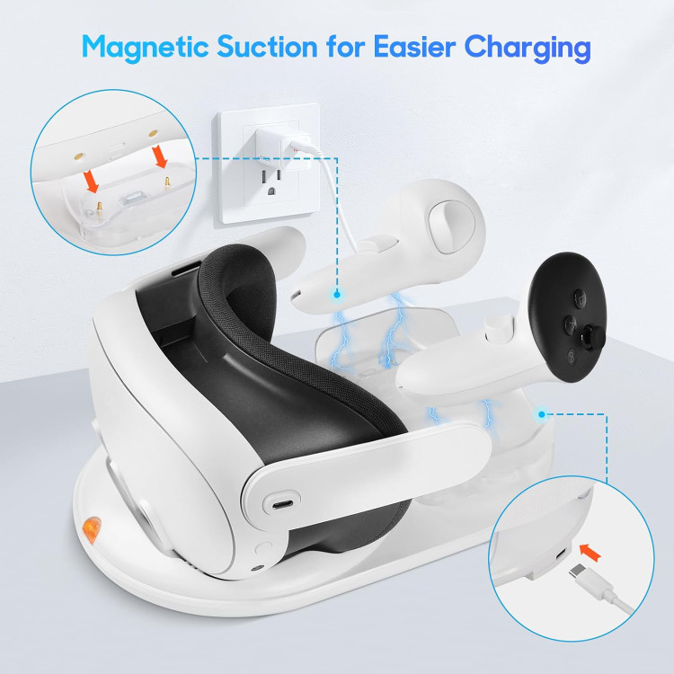 این داک با استفاده از مگنتهای قوی، اتصال کاملاً ثابت و بیدردسر را برای هدست و کنترلرها فراهم میکند. تنها کافیست دستگاهها را روی پایه قرار دهید تا بهصورت خودکار فرآیند شارژ آغاز شود. چراغ LED وضعیت شارژ نیز با رنگهای سفید و نارنجی، وضعیت شارژ را بهوضوح نمایش میدهد.