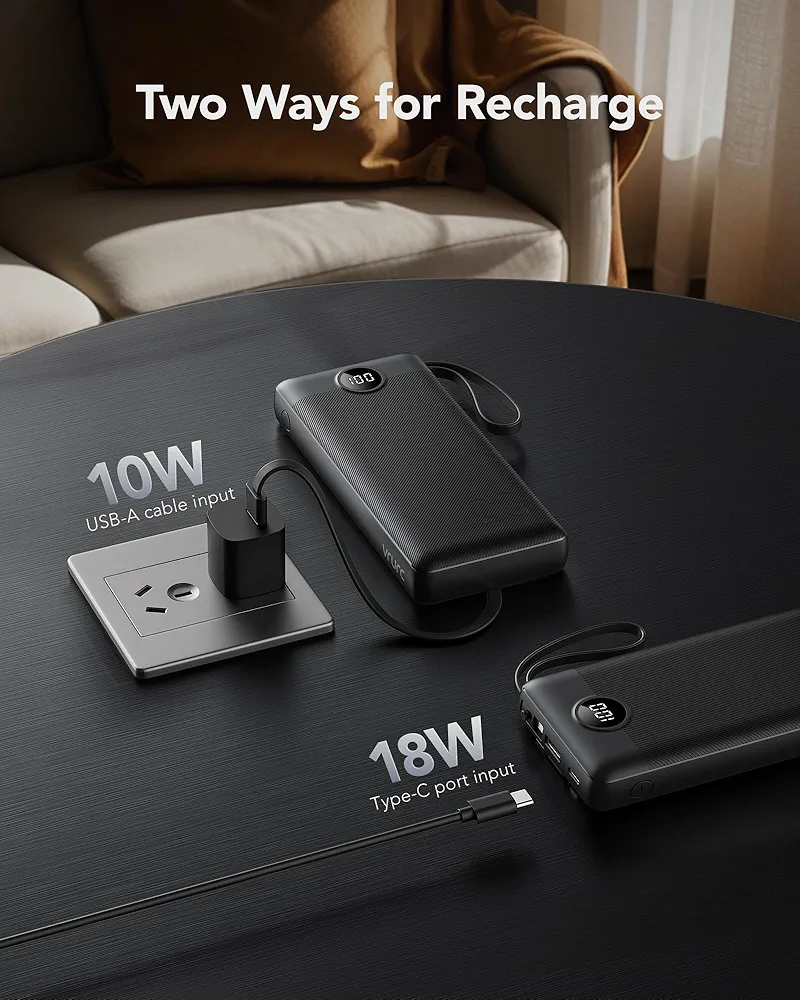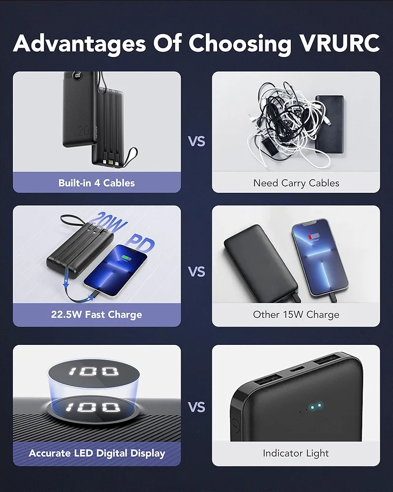 این مدل مجهز به سه کابل داخلی شامل Type-C، Lightning و USB بوده که نیاز به حمل کابل جداگانه را بهطور کامل برطرف میکند. همچنین وجود خروجیهای متعدد، امکان شارژ همزمان چند دستگاه را فراهم میسازد. این ویژگیها باعث شده پاوربانک VRURC به گزینهای عالی برای سفر، محل کار، دانشگاه و استفاده روزمره تبدیل شود.