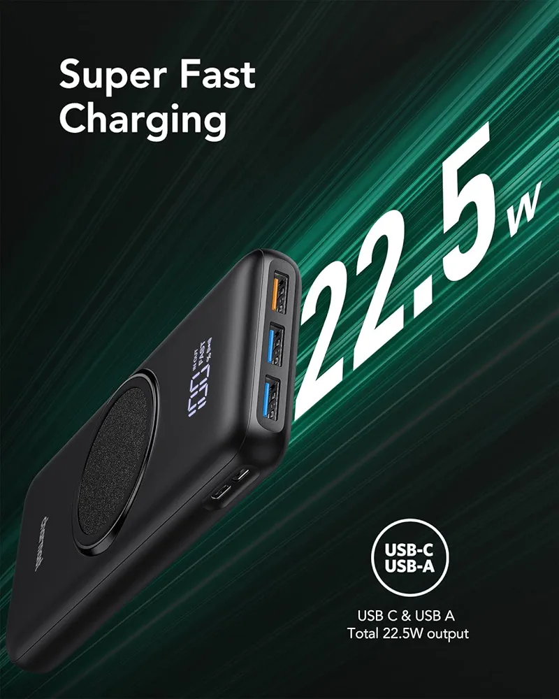 ویژگی برجسته این مدل، شارژ بیسیم با توان ۱۵ وات (Qi) است که به شما امکان میدهد بدون نیاز به کابل، گوشی خود را روی سطح پاوربانک قرار داده و بهصورت سریع و ایمن شارژ کنید. همچنین وجود پورتهای USB-C و USB-A باعث میشود بتوانید همزمان چند دستگاه را با سرعت بالا شارژ نمایید.