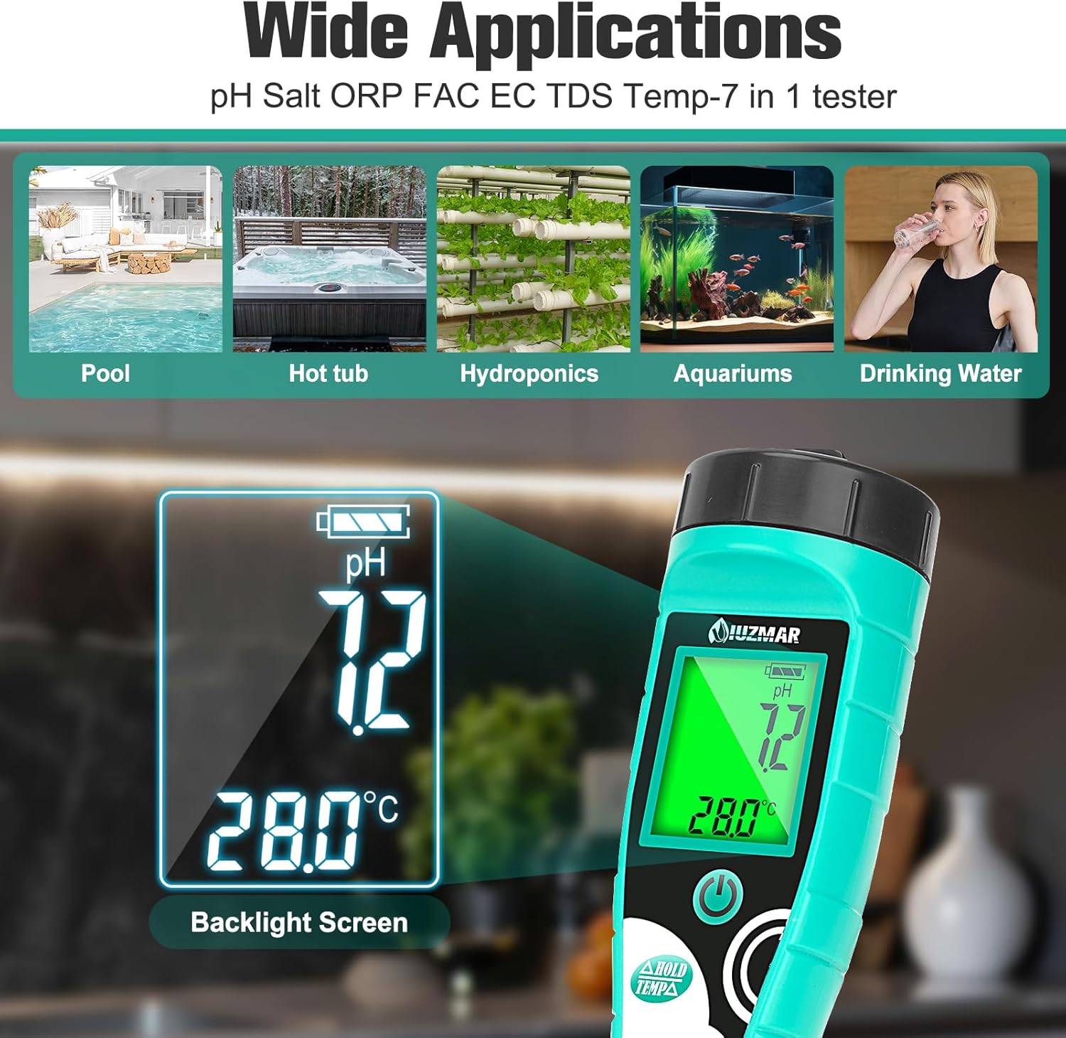 دستگاه تست کیفیت آب UIUZMAR مدل UI-CL02 یکی از دقیقترین و حرفهایترین ابزارهای دیجیتال برای سنجش پارامترهای مختلف آب در استخر، اسپا، آکواریوم و مصارف صنعتی است. این دستگاه چندکاره با بهرهگیری از حسگرهای پیشرفته، قابلیت اندازهگیری pH، کلر آزاد (Free Chlorine)، شوری (Salt/NaCl)، ORP، TDS، EC و دما را بهصورت همزمان دارد و نتایج را روی نمایشگر LCD شفاف و خوانا نمایش میدهد.