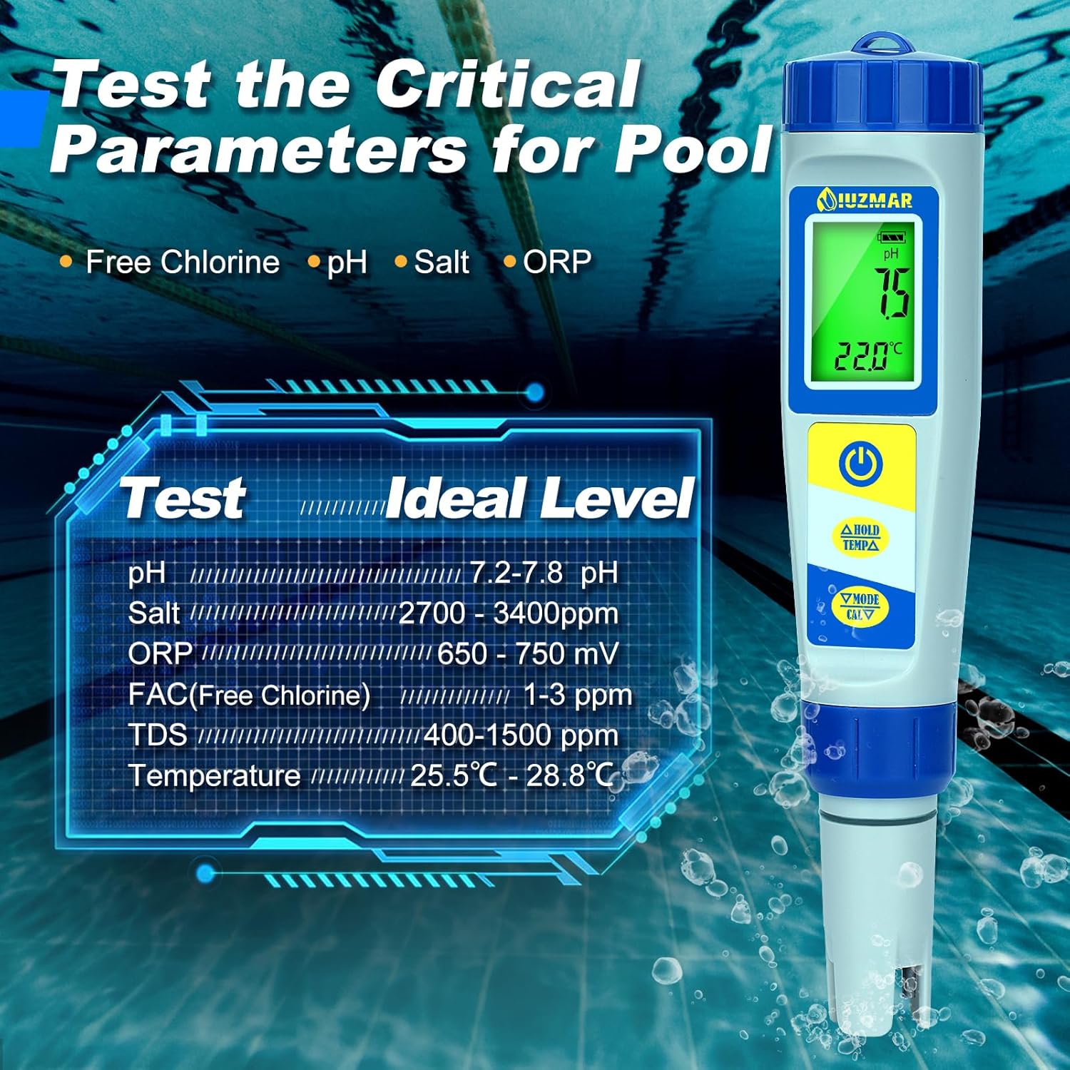 بدنه ضدآب (IP67) و طراحی ارگونومیک دستگاه، دوام بالا و عملکرد پایدار را تضمین میکند. با مصرف انرژی کم و استفاده از باتری داخلی قابلتعویض، این دستگاه انتخابی هوشمندانه برای کسانی است که به کنترل مداوم کیفیت آب اهمیت میدهند.