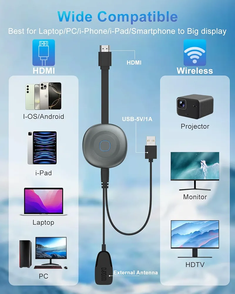 با اتصال این دانگل به پورت HDMI دستگاه نمایشگر و تأمین برق از طریق USB، تنها با چند گام ساده آماده استفاده است. قابلیت پشتیبانی از ورودیهای HDMI، سازگاری با سیستمعاملهای اندروید، iOS، ویندوز و مک و امکان اشتراکگذاری عکس، ویدیو، بازی و حتی ارائههای کاری، این دستگاه را به ابزاری ایدهآل برای استفاده در منزل، دفتر کار یا کلاس تبدیل کرده است.