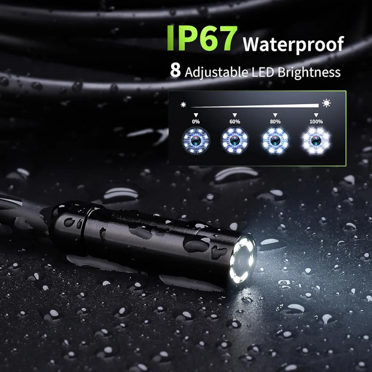 بدنه دوربین دارای استاندارد IP67 است؛ یعنی کاملاً ضدآب بوده و استفاده از آن در فضاهای مرطوب، لولههای فاضلاب، مخازن آب یا محیطهای صنعتی بدون هیچ نگرانی امکانپذیر است. وجود ۸ چراغ LED قابل تنظیم نور را دقیقاً مطابق با شرایط محیط کنترل میکند و به شما دیدی شفاف حتی در تاریکترین نقاط میدهد.