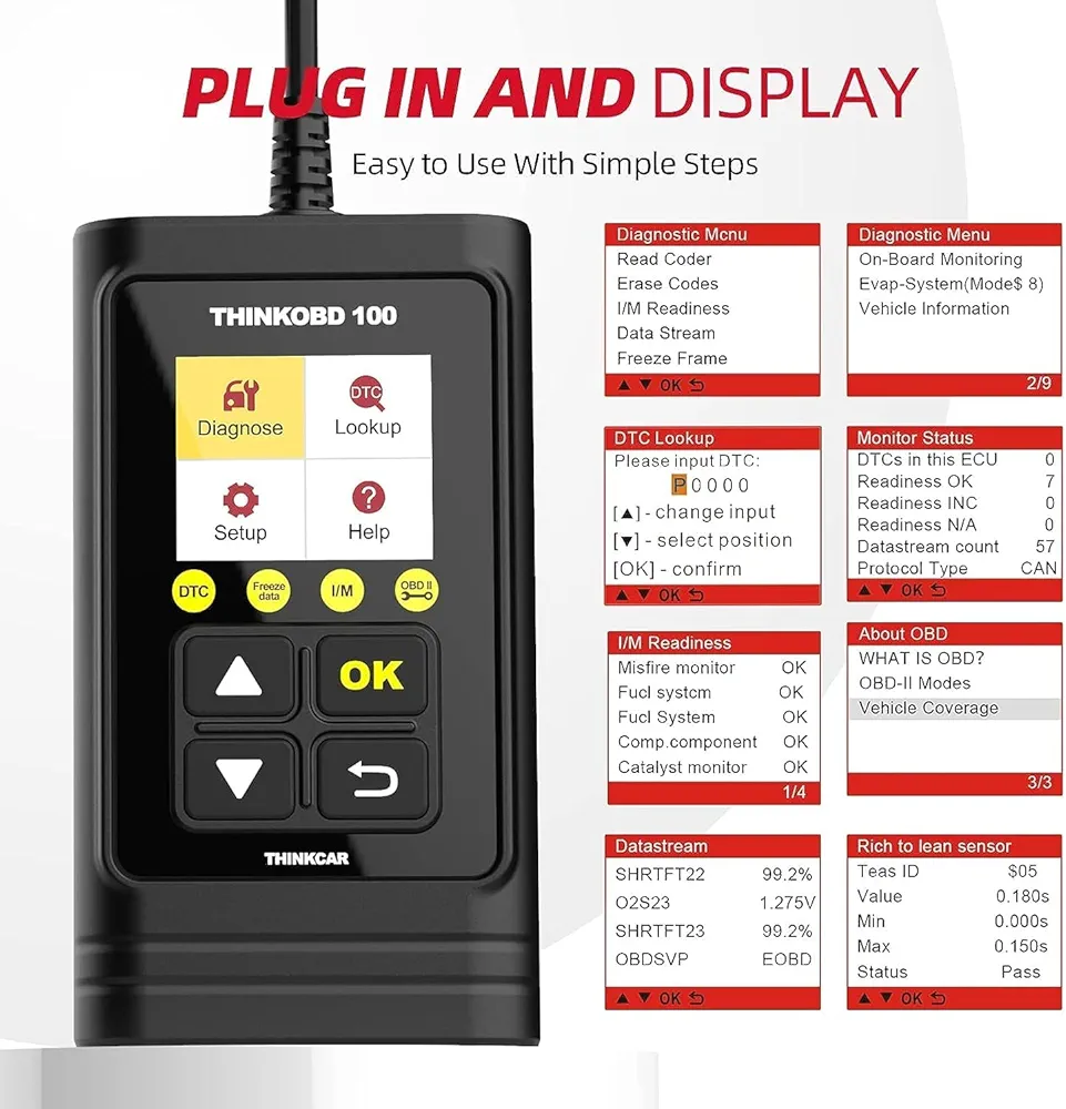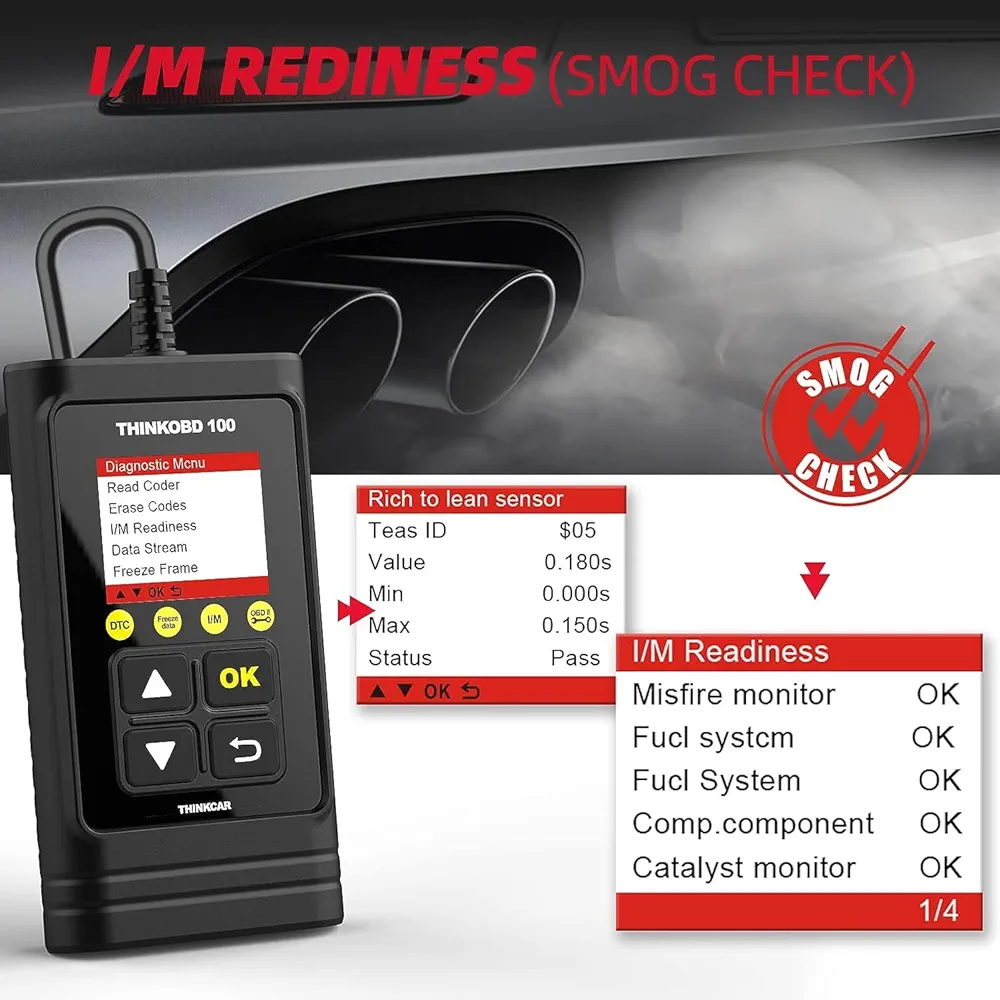 این دستگاه با اکثر خودروهای بنزینی دارای استاندارد OBDII از سال ۲۰۰۱ به بعد سازگار است و به هیچگونه باتری یا شارژ نیاز ندارد؛ زیرا انرژی خود را مستقیماً از پورت OBD دریافت میکند. یکی از مزیتهای مهم THINKOBD 100، ارائه اطلاعات Freeze Frame، تست I/M readiness و قابلیت انجام Smog Test است که برای بررسی وضعیت آلایندگی خودرو کاربرد زیادی دارد.