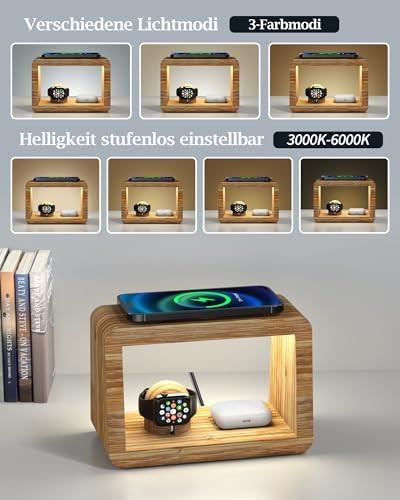 در بخش پایینی استند، یک پایهی اختصاصی برای ساعت هوشمند تعبیه شده است که بهطور کامل با ساختار ارگونومیک اپل واچ و دیگر ساعتهای مشابه سازگار است. کنار این پایه نیز یک پد شارژ بیسیم برای ایربادزهای وایرلسی قرار دارد تا بتوانید همهی دستگاههای روزمرهتان را در یک نقطه مشخص شارژ و مرتب نگه دارید. نورپردازی داخلی ملایم و مدرن این محصول، جلوهای گرم و لوکس به محیط میدهد و آن را به انتخابی عالی برای هدیه و همچنین دکور منزل یا دفتر تبدیل میکند.